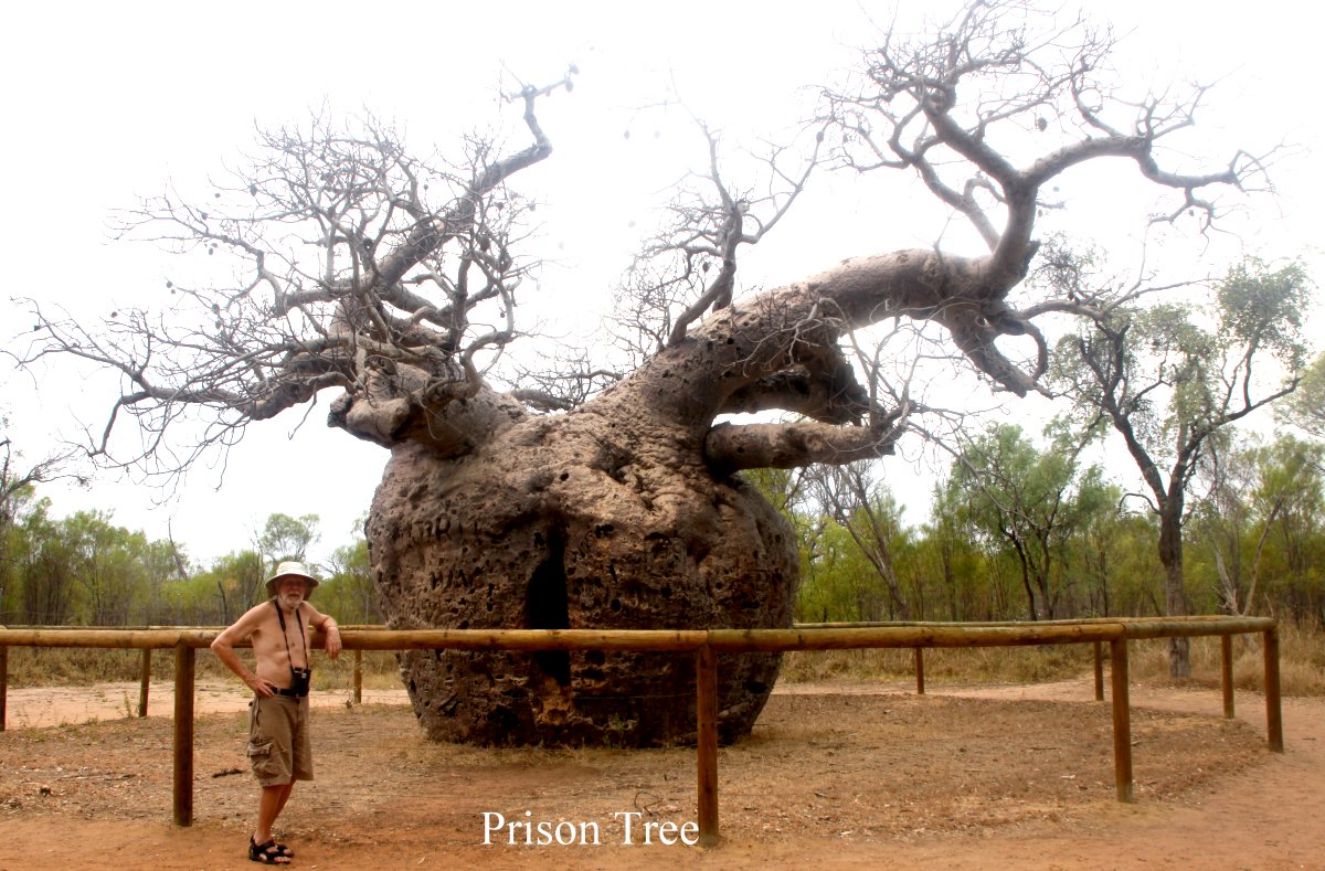 Gegen 5.30 h wurden wir durch lautes Vogelgezwitscher geweckt. Wir hatten beide wegen der defekten Klimaanlage saumäßig schlecht geschlafen. Ich war zweimal aufgestanden und hatte mich draußen mit dem Wasserschlauch abgespritzt und mich dann wieder nass ins Bett gelegt. Aber auch das half nicht viel, da anders als in der Wüste hier am Meer die Temperatur nachts nur minimal absinkt. Wir packten alles zusammen und fuhren gegen 6.30 h ab. Ein kurzer Besuch an der Jetty war ziemlich langweilig. Es war ziemlich schmutzig und es gab nichts zu sehen. Da auch der Himmel wolkenverhangen war, eignete sich das schlechte Licht überhaupt nicht für Fotos. Am Ortsausgang tankte ich wieder voll. Einen kurzen Blick noch in die Umgebung der Kläranlage, aber auch dort sahen wir außer einigen schon bekannten Vögeln nichts Neues. Also weiter Richtung Broome. Nach etwa 5 km kamen wir an dem berüchtigten Prison Tree vorbei , einem besonders alten und dicken Boab Tree, den Tomoko ziemlich hässlich fand. Auf einem Schild wird die Geschichte dieses Baums erzählt (siehe Foto), ziemlich makaber finde ich... |