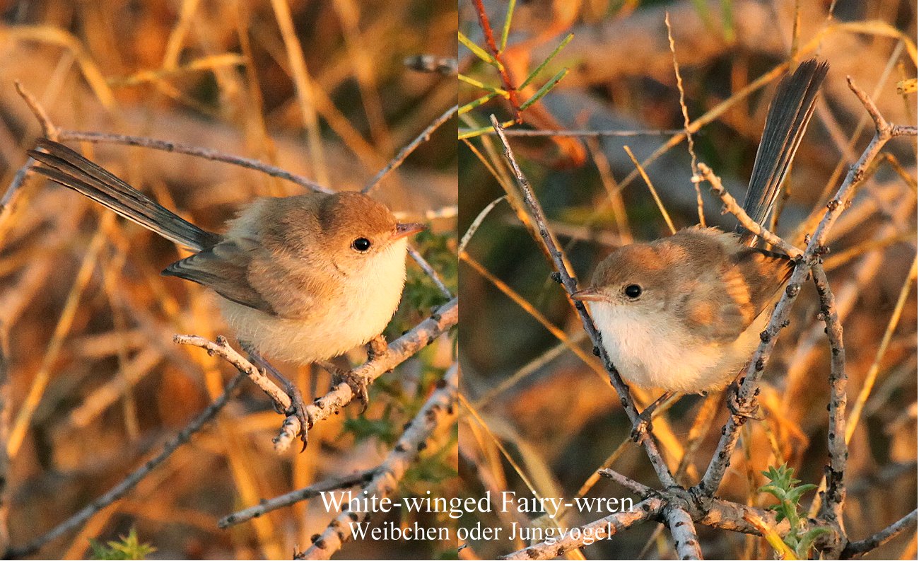 Nach ein paar Fotos fuhren wir auf den Campingplatz. Hier waren offensichtlich noch 2 Plätze frei. Als wir aber gerade auf einen gefahren waren, kam ein junges Paar vorbei, das genau diesen Platz reserviert hatte, wie sie uns auf einer Quittung zeigten. Ein Camp Host war auch hier nicht zu sehen. Also räumten wir das Feld, belegten den letzten freien Platz und warteten. Sicherheitshalber ließen wir alles unausgepackt im Auto. Ich inspizierte in der Zwischenzeit mal den Strand und Tomoko erkundete die nähere Umgebung. Dabei konnte sie einen männlichen Variegated Fairy-Wren und einen Singing Honeyeater fotografieren. |