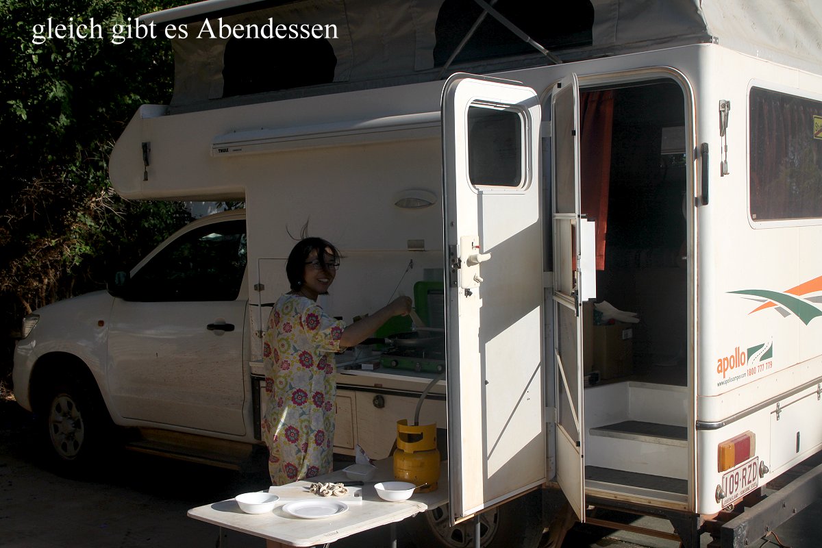 Wir hatten unseren Tisch in die Sonne gestellt. Als die aber hinter den Bäumen langsam verschwand, wurde es merklich kühler. Die Leute nebenan wurden immer fröhlicher, so dass wir uns entschlossen, zur Rezeption zu gehen und um einen ruhigeren Platz zu bitten. Wir hatten auch schon einen gefunden, auf den wir problemlos wechseln durften. Schnell gingen wir zum Auto zurück, packten alles wild durcheinander ins Auto, einschließlich des noch ungespülten Geschirrs, und verließen fluchtartig den Platz. Am neuen Stellplatz angekommen, schloss ich alles wieder an (Gas und Strom), machte Wasser heiß und spülte das schmutzige Geschirr, während Tomoko schon duschen ging. Ein Grey Shrike-thrush sang dazu mit solch variablen Strophen, die ein wenig an den Gesang der heimischen Nachtigall erinnerten. Das war wesentlich angenehmer als das Geschrei unserer Nachbarn vorhin. Eine schmale Mondsichel am Himmel erinnerte daran, dass es jetzt wieder langsam auf Vollmond zuging. Tomoko bereitete schon für morgen früh Sandwichs vor, da wir zeitig ohne zu frühstücken aufbrechen wollen, um einige Gebiete zu erkunden, die in der heute erhaltenen Broschüre als aussichtsreich für Vogelbeobachtung beschrieben waren. Ich schrieb noch meinen Tagesbericht fertig, Tomoko arbeitete wie immer mit ihrem Netbook. Früh gegen 21.15 h gingen wir schlafen. |
