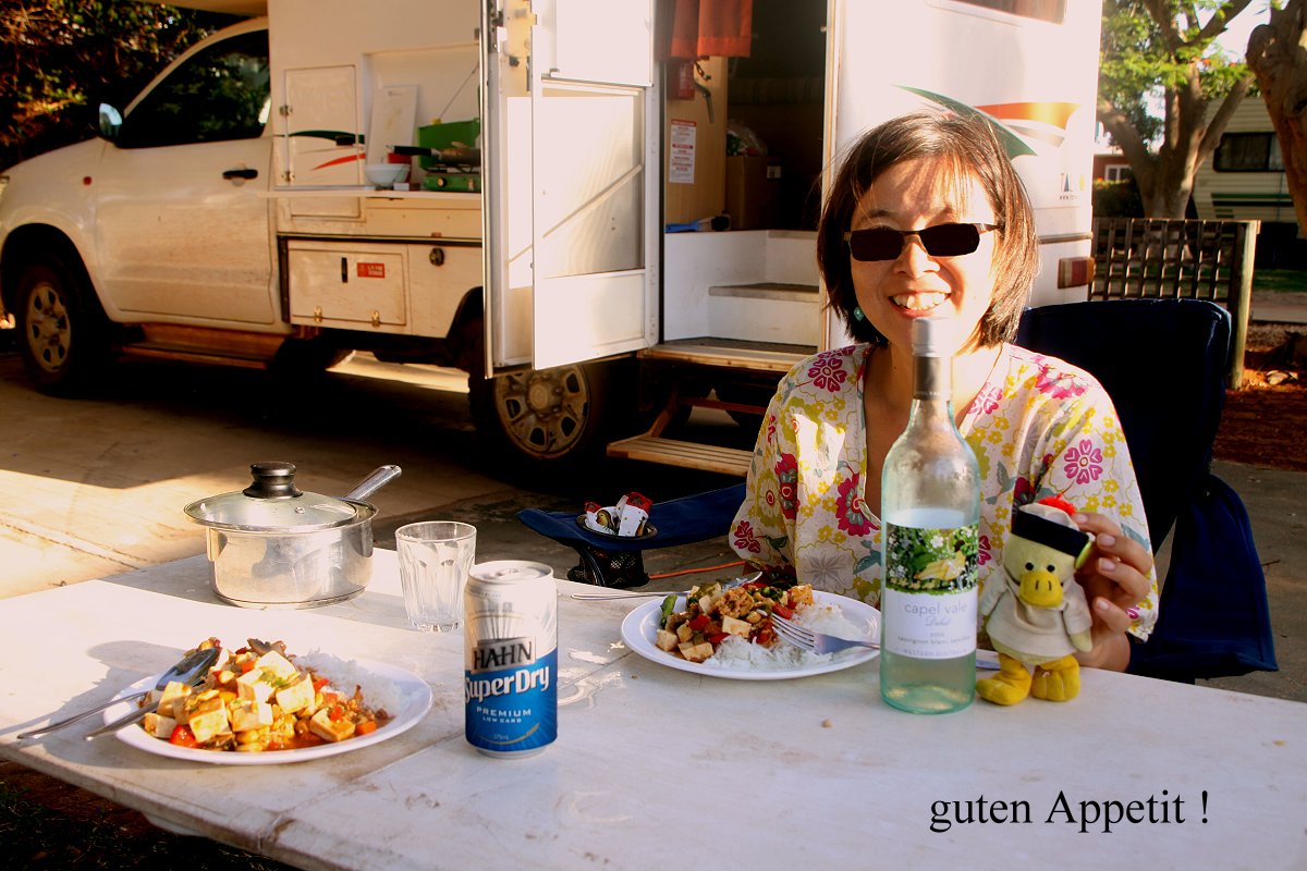 Die Leute auf dem Platz hinter uns, die schon seit unserer Ankunft pausenlos mit lauter Stimme gequatscht hatten, wurden immer lauter und fröhlicher, so dass wir uns Gedanken machten, eventuell den Platz zu tauschen. Zunächst aber kochte Tomoko ein großartig schmeckendes Abendessen, gebratenes Gemüse mit Tofu und Cashew-Nüssen in süß-saurer Soße. Dazu gab es Reis. Da wir nur eine Dose Bier kalt gestellt hatten, trank ich das Bier und Tomoko ein Glas Weißwein dazu, das schmeckte wirklich hervorragend. |