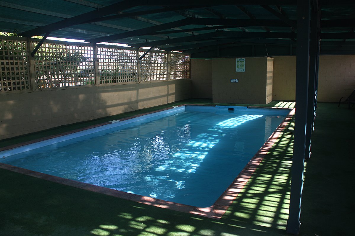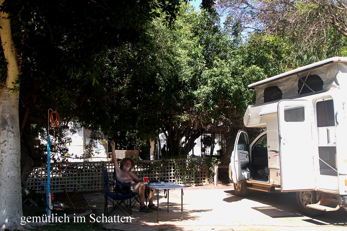 Tatsächlich erhielten wir hier für 35 $ einen schönen schattigen Platz, wo wir uns gleich mal häuslich einrichteten. Da wir in den nächsten Tagen vielleicht wieder auf Campingplätzen ohne Wasser und Strom übernachten wollen, füllte ich unsere beiden leeren 25 l-Tanks mit frischem Wasser auf, ebenso den Wasserbehälter unter unserer Spüle im Auto. Ich studierte gemütlich die mitgenommenen Prospekte, was mich ganz müde machte. Ein von Tomoko gemachter Kaffee machte mich nach dem schlappen Kaffee im Café wieder munter. Ich fing schon mal mit Tagebuch schreiben an, Tomoko arbeitete weiter an ihrer Übersetzung. Um 16.00 h inspizierte ich den nahen Swimmingpool. Dieser war vollkommen überdacht und von einem hohen Holzgitter umgeben. Er erinnerte mich fast an ein Hallenbad. Da der Wind wieder stark aufgefrischt hatte, war es mir zu kalt, im Schatten im Pool zu schwimmen und ich ging wieder zurück. |