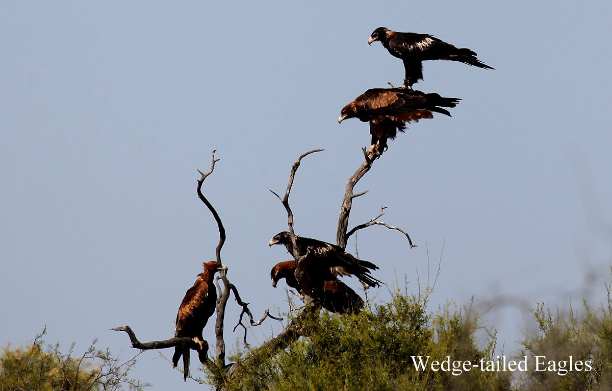 Je weiter wir nach Süden kamen, um so mehr änderte sich das Landschaftsbild. Immer mehr größere Sträucher und vereinzelt auch Bäume säumten die Straße und die Termitenhügel wurden immer weniger. An einer Stelle hielten wir plötzlich an. Mindestens 10 Adler (Wedge-tailed Eagle) saßen am Straßenrand und flogen auf, als wir anhielten. Einige ließen sich auf einem naheliegenden Baum nieder, andere kreisten in der Luft weiter. Das war schon beeindruckend, diese mächtigen Vögel in so großer Zahl zu sehen. |