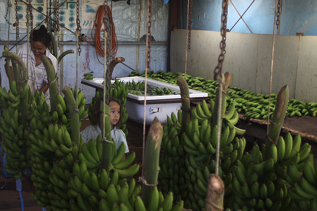 Anschließend fuhren wir noch mal kurz zu der Bio-Farm von gestern. Hier kauften wir für 6,- $ noch 12 frische Eier ein, da die gestern bei Woolworths gekauften schon ziemlich schlecht waren. Die nette Verkäuferin, aus Bali stammend, war gerade dabei, Bananen für den Verkauf vorzubereiten. Ganze Stauden hingen in einem kleinen Schuppen an der Decke. Davon schnitt sie einzelne Stücke ab und legte sie in eine mit Wasser gefüllte Badewanne. Das diente dazu, um eventuell in den Stauden verbliebene Insekten wie Spinnen usw. zu entfernen. Wir machten ein paar Fotos und fuhren dann weiter. |