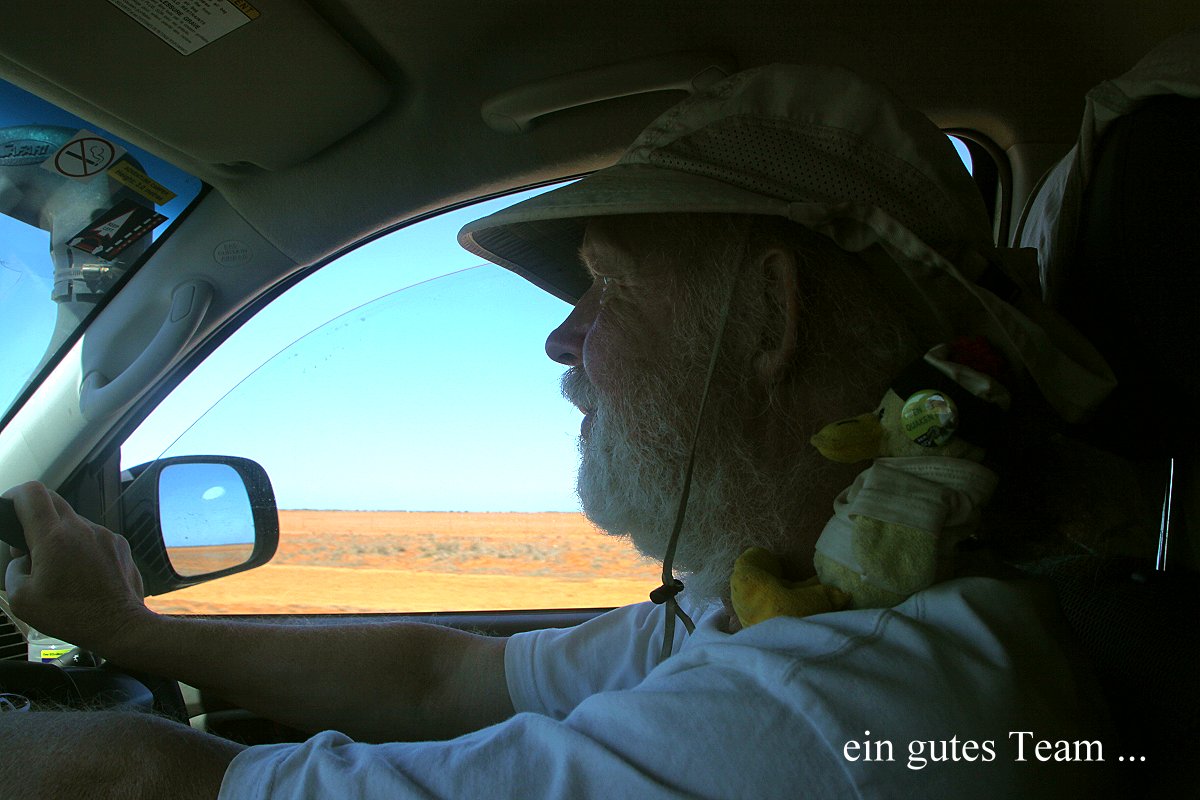 Noch mal ein kurzer Stopp beim ersten Laden, Tomoko hatte Paprika vergessen, dann ging es gegen 9.30 h endlich los. Die Straße Richtung Denham / Monkey Mia führte wieder durch ziemlich eintönige Landschaft, alles flach mit stacheligen kleinen Büschen auf endlosem roten Sand. Einige Schwertransporte begegneten uns, die mit hoher Geschwindigkeit daherfuhren, auf der ziemlich engen Straße nicht ungefährlich. |