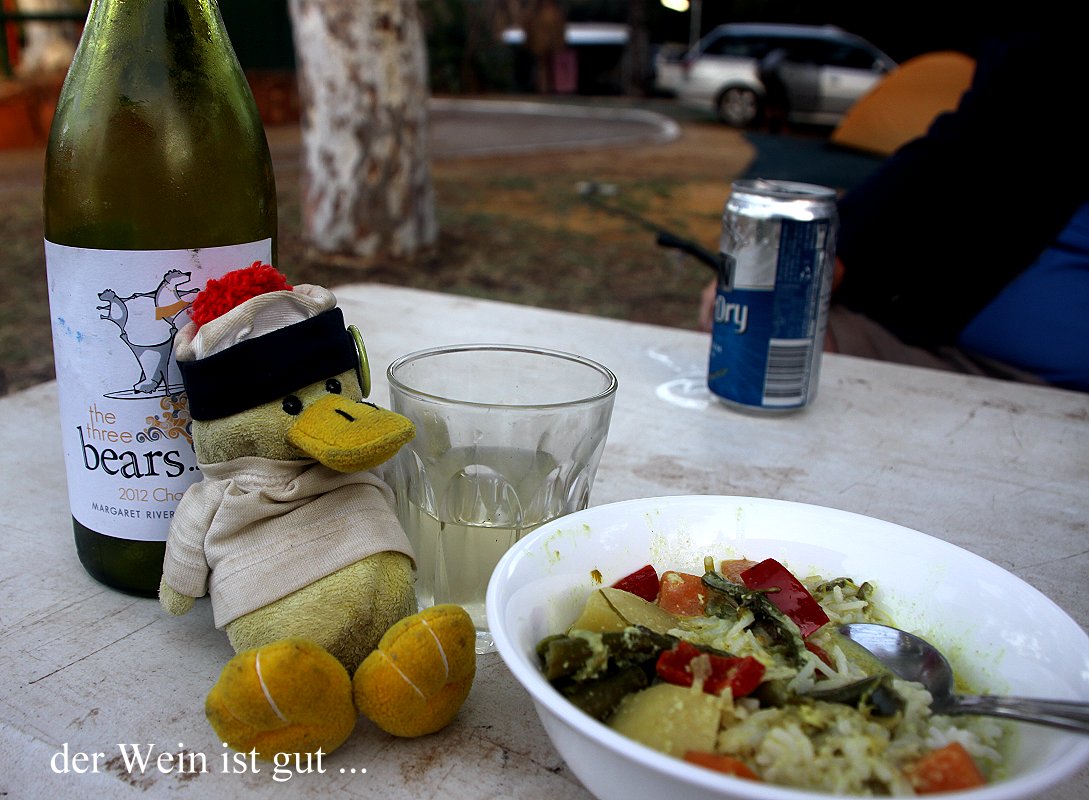 Kurz nach 18.00 h waren wir zurück beim Caravan-Park. Das Curry-Gericht, das Tomoko vorher schon zubereitet hatte und in der Spüle des Autos zwischengelagert hatte, hatte die Fahrt gut überstanden, alles war noch im Topf. Den erwärmten wir schnell, gossen den Inhalt in ein Schälchen, dann über den ebenfalls schon vorgekochten Reis und fertig war das Abendessen. Das schmeckte vorzüglich. Dazu gab es Bier und Weißwein.