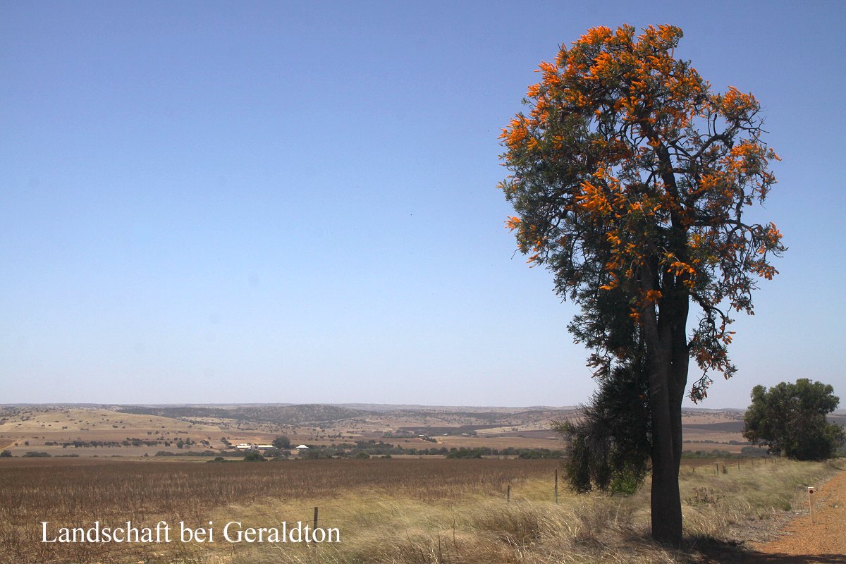Wir verließen Kalbarri in südlicher Richtung. Auf der Strecke lag die Abzweigung zum Natural Window am Meer, 4 km entfernt. Als wir am Parkplatz dort ankamen und sahen, dass man noch 700 m bis zum Meer gehen musste, verzichteten wir angesichts des wieder aufgefrischten starken Windes auf den Spaziergang und fuhren weiter. Kurz darauf verließen wir den Kalbarri NP. Einige schöne Blumen konnten wir noch fotografieren, |