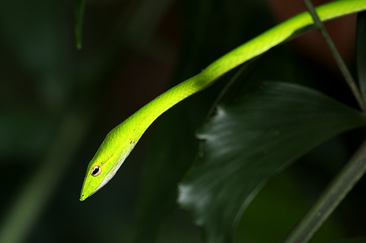Kurz vor Erreichen des Orchid Gardens sahen wir, wie einige Leute intensiv in einen Busch schauten und fotografierten. Als wir näher kamen, sahen wir den Grund. Eine giftgrüne Baumschlange (höchstwahrscheinlich nicht giftig) wand sich um einen dünnen Ast, verharrte dort aber fast bewegungslos. Wir machten ein paar Fotos und gingen weiter. |