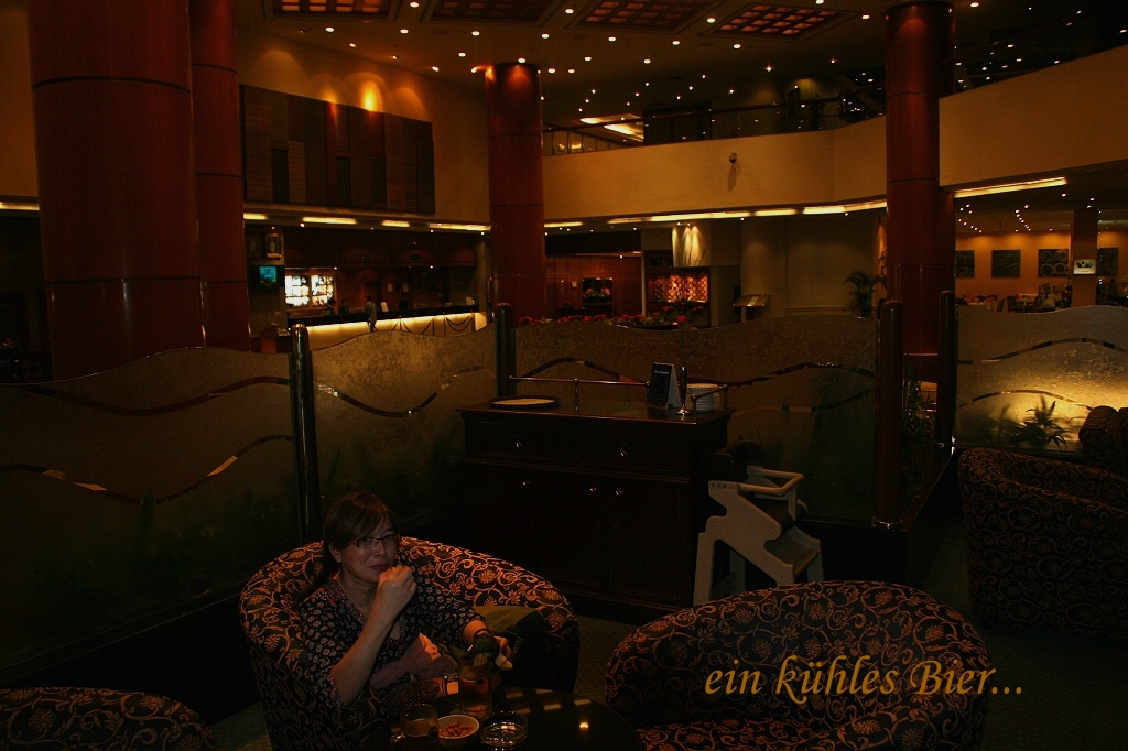 Alsbald wurde ein Gaskocher auf den Tisch gestellt und 3 große Schalen mit den Zutaten für das Steam-Boat. In dem zweigeteilten Topf wurden 2 Suppen erhitzt, eine scharfe Tom Yam Suppe sowie eine Hühnerbrühe. Darin garten wir dann die einzelnen Zutaten: Hähnchenfleisch, Fisch, Garnelen, Fischbällchen, Tofu, Eier, diverse Gemüse und 2 Sorten Glasnudeln. In 3 kleinen Schälchen befanden sich Saucen zum Würzen. Das ganze schmeckte vorzüglich. Tomoko trank heute kein Bier, was Entelchen sehr schade fand, aber wenigstens ich trank zwei Tiger-Bier. Das Essen machte richtig satt, lag aber nicht schwer im Magen. Wir blieben noch eine Weile im Restaurant. Da hier das WLAN funktionierte, konnten wir mit unseren Netbooks ins Internet gehen. Gegen 21:30 Uhr gingen wir zurück ins Zimmer und legten uns auch alsbald schlafen. |