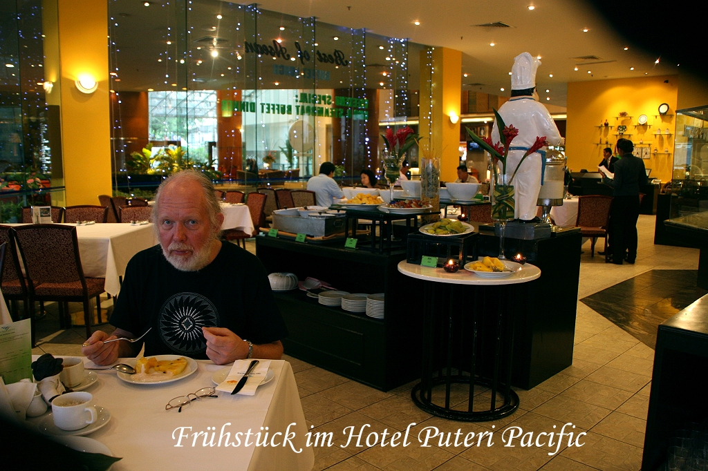 Heute gab es Toast mit Geflügelschinken und Käse, sowie Kaffee und Mangosaft. Anschließend kaufte Tomoko noch einen schönen Schirm, den man auch gut als Sonnenschirm benutzen kann. Da um 11:00 Uhr das Taxi nach Johor Bahru uns abholen würde, gingen wir zum Hotel zurück und packten unsere Koffer. Als wir hinunter in die Hotel-Lobby kamen, wartete unser Taxi schon auf uns. Es war der gleiche Fahrer, der uns schon im letzten Oktober gefahren hatte und der uns damals seine Telefonnummer gegeben hatte. Schnell war das Gepäck verstaut und in zügiger Fahrt ging es nach Norden Richtung Grenze nach Malaysia. Es herrschte relativ wenig Verkehr, so dass wir schon nach rund 20 Min. die Grenze erreichten. Auch hier war es ziemlich ruhig und sowohl bei der Ausreise aus Singapur als auch bei der Einreise nach Malaysia ging alles sehr schnell. Das Taxi brachte uns zum "Old Bus Terminal" (Die Taxifahrer aus Singapur sind verpflichtet, diesen Ort in Johor Bahru anzufahren und dürfen nicht direkt zu einem Hotel fahren, um dort ihre Gäste aussteigen zu lassen). Wir bezahlten also 45,- S$ (25,- €) für den Transfer und obwohl unser Hotel Puteri Pacific in Sichtweite lag, mussten wir von hier für die kurze Strecke ein malaysisches Taxi nehmen, das 10,- MYR (2,20 €) kostete. Der Empfang am Hotel war wie immer sehr freundlich. Erstaunlicherweise war das Zimmer trotz der frühen Uhrzeit (es war noch vor 12:00 Uhr) schon bezugsfertig. Es lag im 8.Stock mit herrlicher Aussicht über die Umgebung, die trotz der hässlichen Hochhäuser noch Raum für saftige Grünanlagen hatte. Da unser Frühstück nicht besonders üppig war, verspürten wir leichten Hunger. Wir hatten vom letzten Besuch noch eine gute Erinnerung an das Mittagessen im chinesischen Restaurant dieses Hotels. |