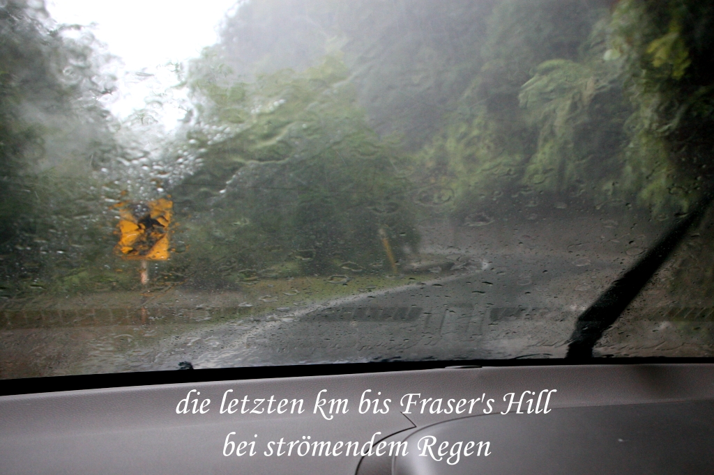 Hier tankten wir noch einmal voll für 50 MYR (11.- €) und begaben uns auf die letzten 55 km nach Fraser's Hill. Wir lagen gut in der Zeit, wollten wir doch um 17:00 Uhr an der Schranke sein, die nur zu einer ungeraden Stunde geöffnet ist, um die letzten 8 km bis hinauf zum Gipfel zu fahren. Dieser letzte Teil ist so eng, dass der Verkehr nur in eine Richtung fahren kann. Dies geschieht immer abwechselnd jede Stunde. Wir hatten kaum die Schranke passiert, als es wie aus Sturzbächen zu regnen anfing. Wir konnten kaum noch etwas sehen. Das Regenwasser floss immer stärker die Straße hinunter, so dass wir an einigen Stellen den Eindruck hatten, wir führen einen reißenden Fluss stromaufwärts. |