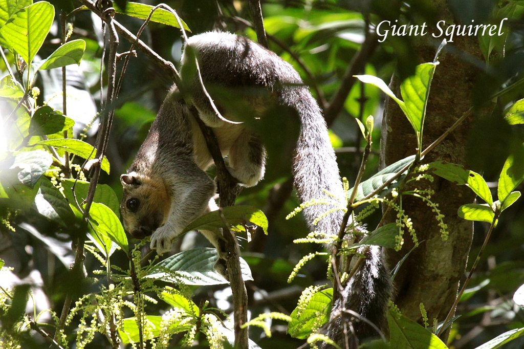 Mit annähernd 40 km/h ging es 15 km stromaufwärts und nach 25 min erreichten wir das Camp. Robert Chong der Besitzer begrüßte uns herzlich und erzählte uns schon mal, was hier eventuell in den nächsten beiden Tagen zu erwarten war. Währenddessen entdeckte Tomoko ein Giant Squirrel, das flink einen Baumstamm hinaufkletterte. |