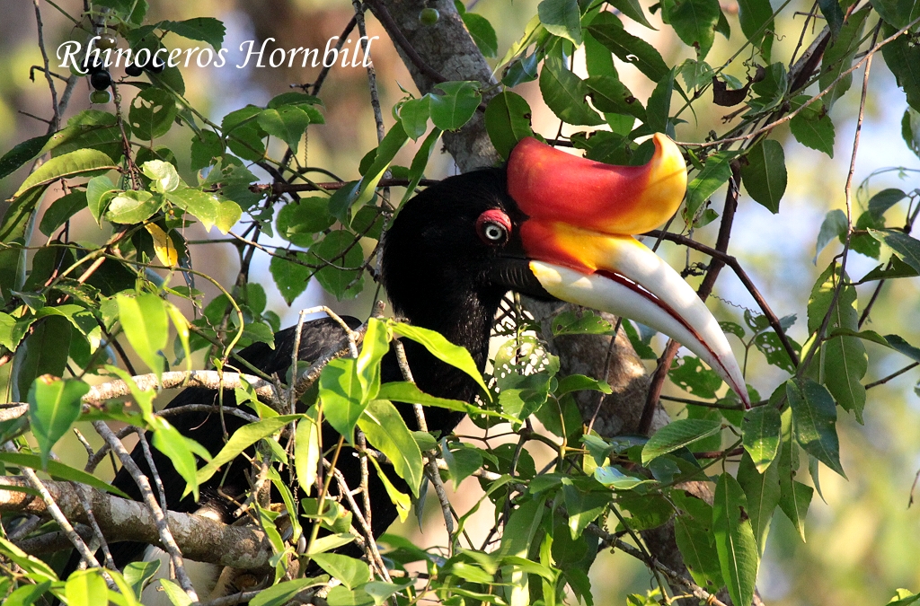 Die Sonne sank jetzt am späten Nachmittag immer tiefer und tauchte die Landschaft in ein warmes Licht. Dieses warme Licht ließ die Köpfe von zwei Rhinocerous Hornbills, die wir auf einem Baum sitzend antrafen, in schönen kräftigen Farben leuchten. |