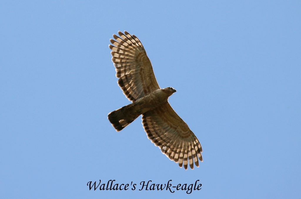 Dann blieb er eine Weile hoch in einem trockenen Baum sitzen, sehr zu unserer Freude, denn so konnten wir einige Fotos von ihm machen. Meistens hört man den Ruf des Gibbon kilometerweit durch den Dschungel schallen ohne ihn zu Gesicht zu bekommen. Über unseren Köpfen antwortete auf einmal ein weiterer Gibbon, von dem wir nur einen schemenhaften Schatten erkennen konnten. Es entwickelte sich ein munteres Zwiegespräch zwischen den beiden, so dass wir immer wieder unsere Köpfe von einer in die andere Richtung drehten. Wir blieben mindesten eine halbe Stunde an der gleichen Stelle und lauschten diesen faszinierenden Stimmen. Zwischenzeitlich kreisten zwei Wallace's Hawk-eagles über unseren Köpfen. |