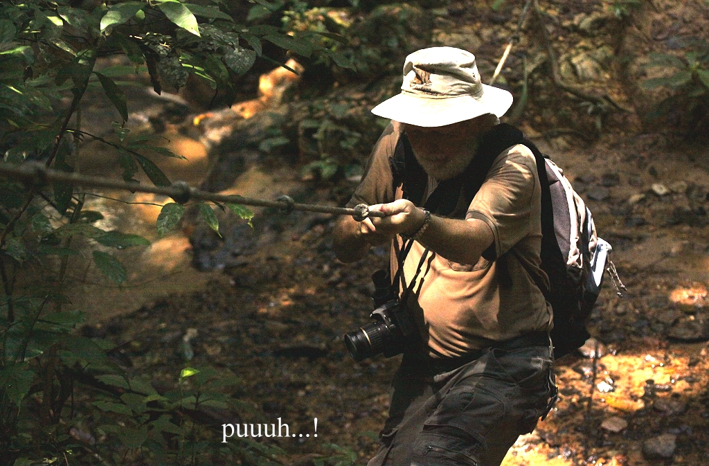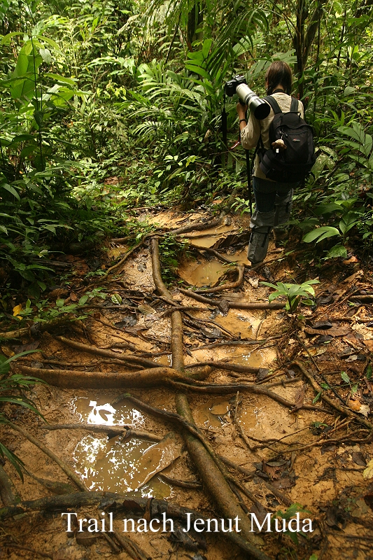 Beim Mutiara Resort sah Tomoko plötzlich etwas durch die Luft fliegen und auf einem Baum landen. Ein merkwürdiges Tier, sah aus wie eine Eidechse, konnte aber fliegen. Tatsächlich handelte es sich um einen Flying Dragon. Diese Eidechsenart kann seine Rippen flügelähnlich spreizen und so durch die Luft gleiten. Nun machten wir uns auf den Weg zum Lubok Simpon am Tahan River. Auf dem Weg dorthin konnten wir auf einem hohen Baum zwei Black Hornbills sehen, die aber bald davon flogen. Am Fluss angekommen machten wir eine kleine Pause. Da es aber hier ziemlich ruhig war, gingen wir bald weiter. Um 9:40 Uhr erreichten wir die Abzweigung nach Jenut Muda. Von hier ging der Weg steil bergauf. Gott sei Dank hatte ich diesmal mein schweres Spektiv nicht dabei, so dass ich den steilen Anstieg viel besser bewältigte als noch drei Tage vorher. Es ging wieder über zahlreiche Baumwurzeln, da der Boden aber ziemlich trocken war, gab es deutlich weniger Leeches. Um 10:20 Uhr erreichten wir den ersten kleinen Bach. |
