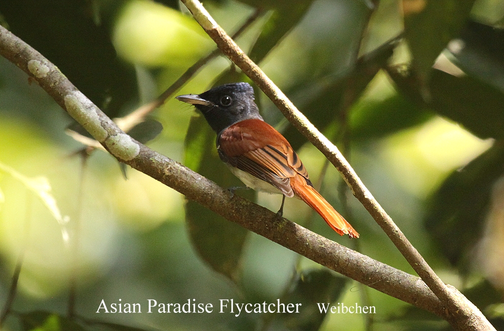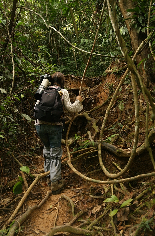 Bei dem nassen Untergrund war es ziemlich schwierig über die rutschigen Baumwurzeln den Hügel hinauf zu klettern. Wenn wir kurz stehen blieben, sahen wir sofort einige Leeches sich auf uns zu bewegen. Immer wieder schauten wir auf unsere Schuhe und die Hosenbeine. Manche Leeches schafften es, an unseren Schuhen hoch zu klettern, doch wir konnten sie immer rechtzeitig daran hindern sich irgendwo festzusaugen. Nach einer halben Stunde hörten wir klopfende Geräusche vor uns. Es waren drei Spechte, die diese Geräusche verursachten. Einen konnten wir sehen und bestimmen, ein prächtiger Orange-backed Woodpecker. Tomoko machte mehr Fotos als üblich, da man bei den schnellen und heftigen Kopfbewegungen des Spechtes nicht sicher sein konnte, ob die Bilder durch Bewegungsunschärfe nicht unbrauchbar würden. |
