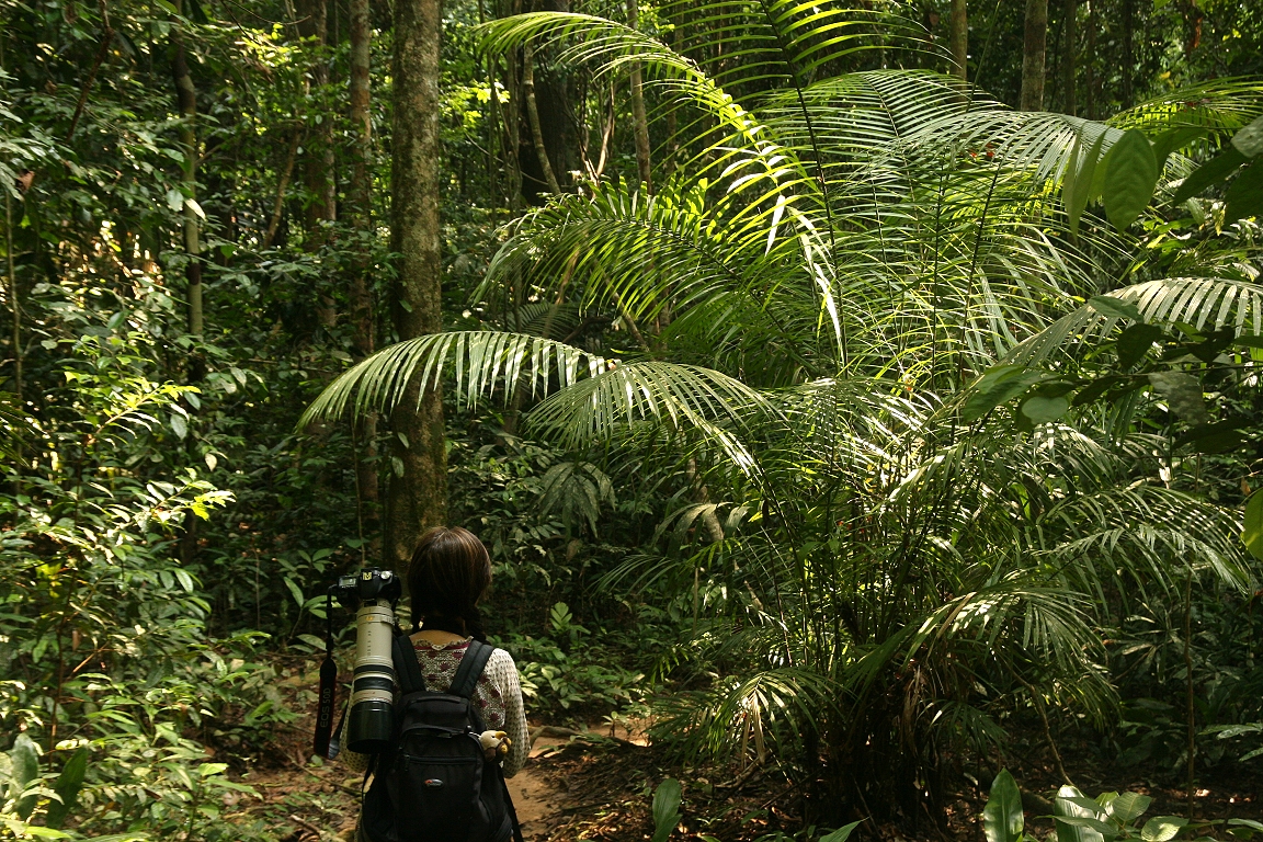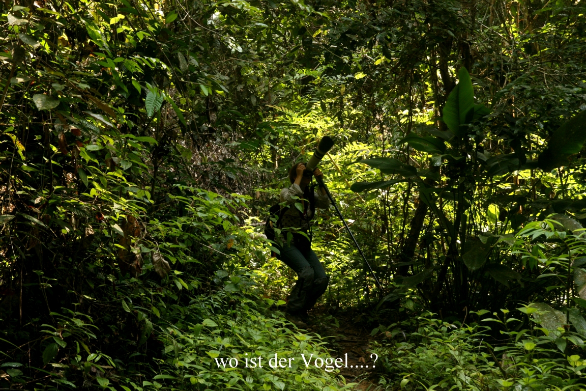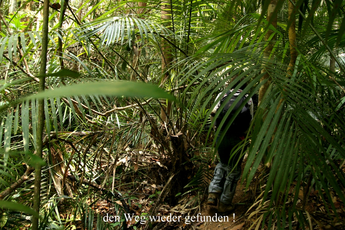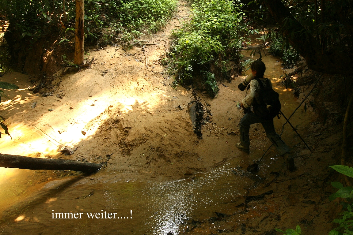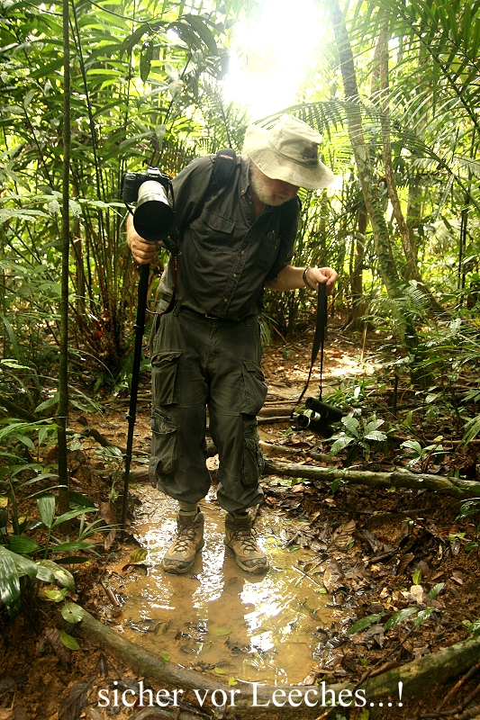 Plötzlich entdeckte ich, dass mein rechter Socken von Blut durchtränkt war. Hatte es doch tatsächlich einer dieser Leeches wieder geschafft! Langsam gingen wir weiter. Aus der Ferne hörten wir immer wieder die Stimme des Garnet Pitta, ein wunderschöner, aber sehr seltener und schwer zu beobachtender Vogel. Leider ließ er sich nicht blicken. |