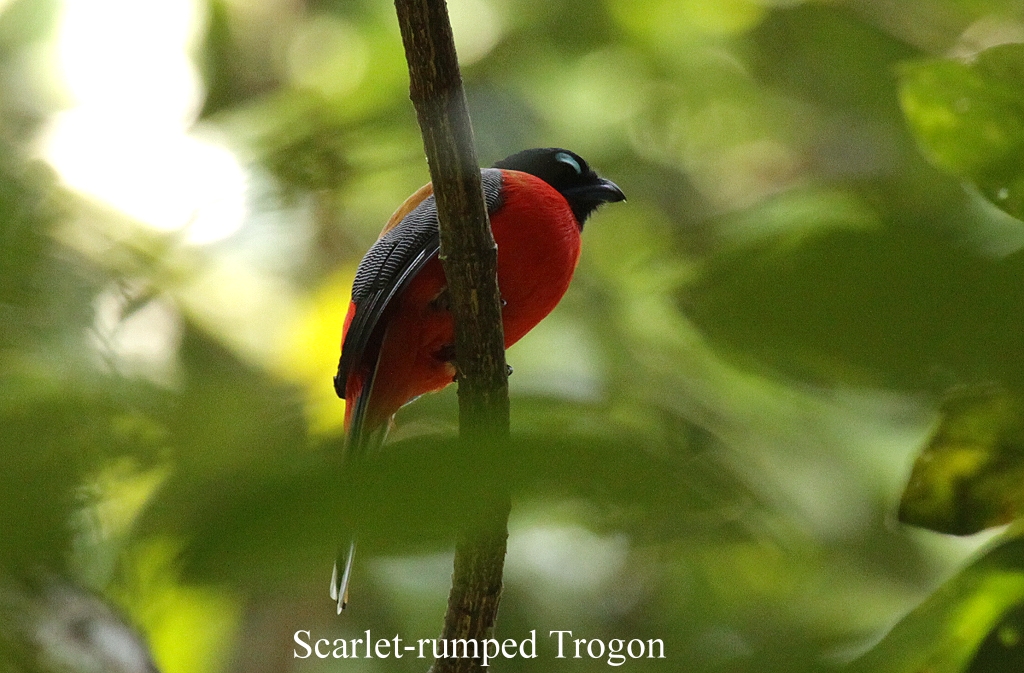 Hier waren plötzlich unglaublich viele Vögel zu sehen und zu hören. Tomoko meinte scherzhaft, dass ihr gesamtes Vogelbuch hier vorhanden zu sein schien. Wir wussten gar nicht, wo wir zuerst hinschauen sollten. Die Liste der Vögel, die wir hier beobachten konnten, ist ziemlich lang: Fiery Minivet, Black-naped Monarch, Ruby-cheeked Sunbird, Bronzed Drongo, Lesser Racket-tailed Drongo, Buff-Rumped Woodpecker, Raffle's Malkoha, Asian Paradise Flycatcher, Spiderhunter, Lesser Cuckooshrike, Chestnut-winged Babbler, Rufous-winged Philentoma, White-rumped Shama. Plötzlich entdeckte Tomoko in den Zweigen einen Vogel mit leuchtend rotem Bauch. Beim näheren Hinsehen konnten wir ihn als Scarlet-rumped Trogon identifizieren, ein wirklich wunderschöner und ziemlich seltener Vogel. Wir blieben etwa eine halbe Stunde an dieser Stelle stehen und freuten uns über unser Glück, hier plötzlich mitten im Urwald so viele schöne und teilweise seltene Vögel beobachten zu können. Da wir uns beide heute konditionell in recht guter Verfassung fühlten, beschlossen wir, dem Weg weiter zu folgen und nicht wie vor drei Tagen zurückzugehen. Zunächst aber setzten wir uns auf einen Baumstamm, aßen ein paar Currypaps und tranken viel Wasser dazu. Auch wenn wir meistens im Schatten des Dschungels wanderten, so war es doch sehr heiß und schwül, so dass mein hellbraunes T-Shirt vor Nässe inzwischen komplett dunkelbraun war. |