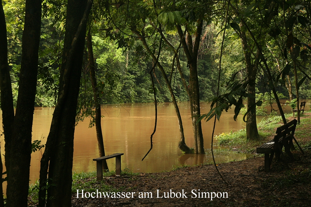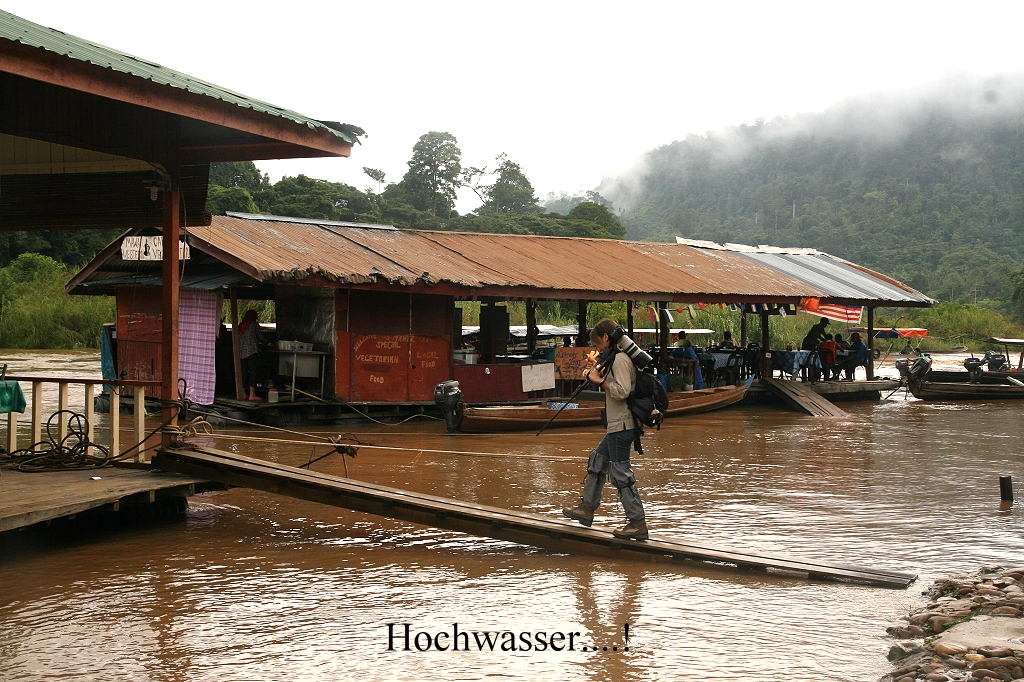 Während der Nacht bildeten sich starke Gewitter mit heftigen Regenfällen. Ich wurde einmal kurz wach, als mir Wasser ins Gesicht tropfte. Als ich das Licht einschaltete, sah ich, dass wieder Wasser durch die Decke tropfte. Anscheinend war das Dach undicht. Ich ließ mich dadurch aber nicht in meiner Nachtruhe stören, sondern schob einfach das Bett ein wenig zur Seite und schlief weiter. Nach dem Frühstück am Morgen fuhren wir wieder zum Fluss. Der Wasserstand des Tembeling Rivers war mindestens 1-2 m höher als gestern. |