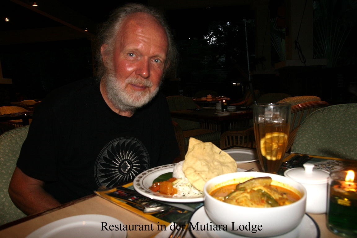 Gegen 18:00 Uhr hatten wir beide großen Hunger und fuhren zum Hotel zurück. Nach einer kurzen Dusche gingen wir hinunter ins Restaurant. Wir waren die einzigen Gäste. Man gab uns die Speisekarte, doch als wir bestellen wollten, mussten wir feststellen, dass einige Speisen auf der Karte gar nicht vorrätig waren. Letztlich aßen wir beide dann ein Nudelgericht, das dampfend auf einer glühend heißen Metallplatte serviert wurde. Da es kein Tiger-Bier gab, tranken wir ein Carlsberg Bier. Wir hatten den Eindruck, als ob wir die einzigen Gäste im Hotel waren. Inzwischen war es ziemlich kühl geworden und Tomoko fing an zu frieren. Deshalb gingen wir auch bald zurück aufs Zimmer, wo Tomoko ein heißes Bad nahm, während ich noch mal mit meinem Computer nach unten ging und etwas Internet schaute. Den Rest des Abends verbrachten wir wie üblich mit Tagebuch schreiben und Fotos sortieren. Um 21:30 Uhr gingen wir schlafen. |