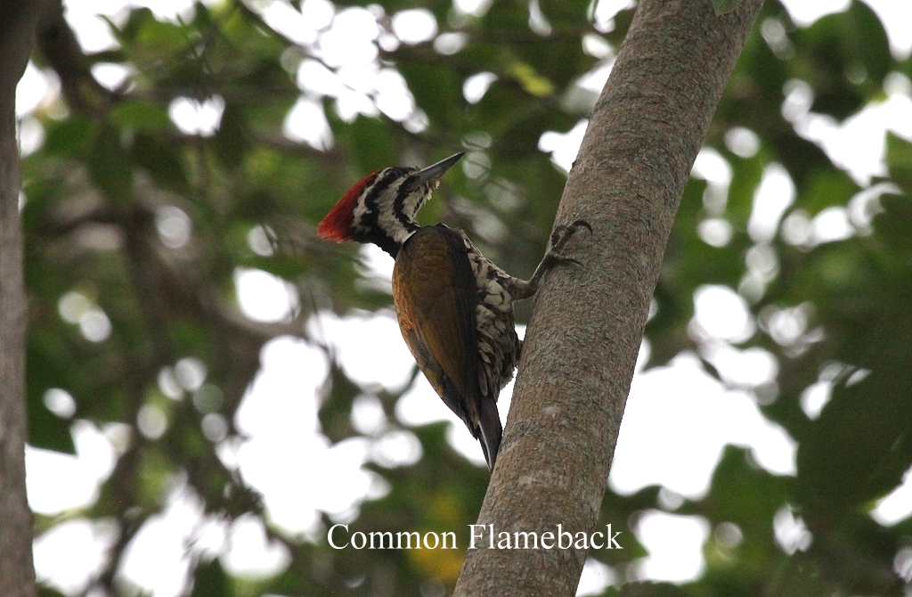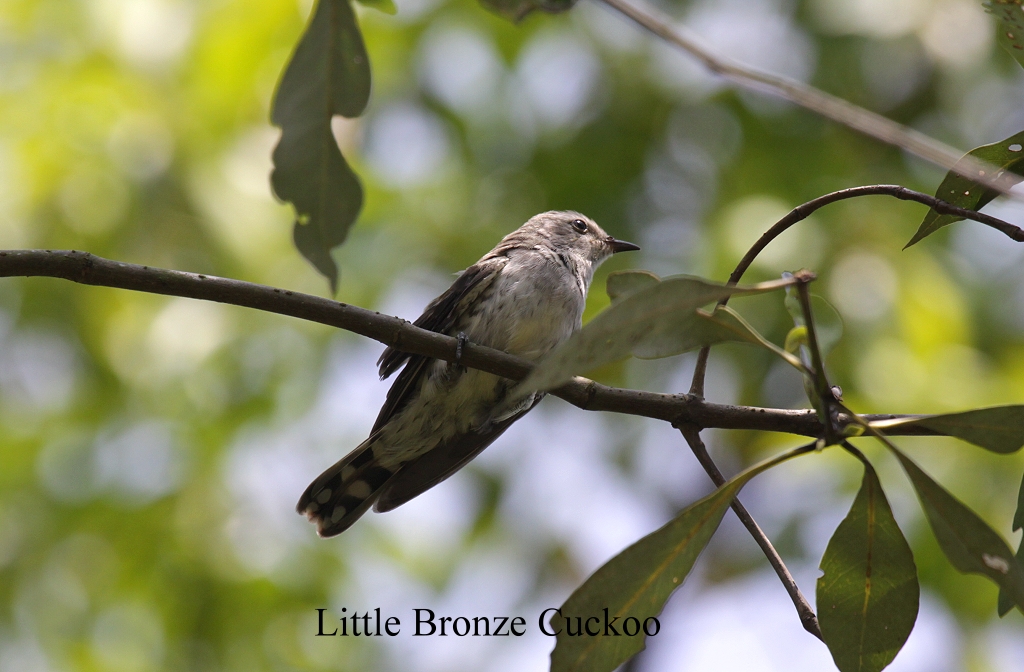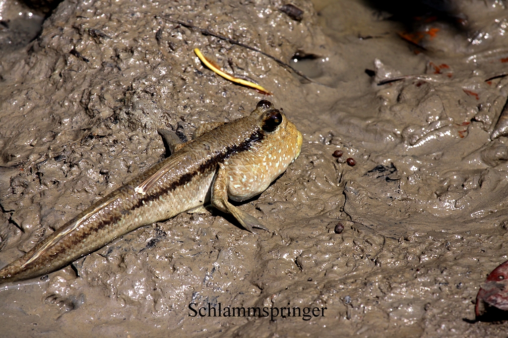 Ein junger Kuckuck (Little Bronze Cuckoo) wurde von einem viel kleineren Gerygone gefüttert. In unmittelbarer Nähe saßen zwei Sacred Kingfishers. Links vom Trail, in einem flachen kleinen See, kämpften zwei Schlammspringer miteinander, gleich daneben schwamm ein Monitor Lizard langsam durch das trübe Wasser. Ein Yellow Iora suchte in einer Mangrove nach Futter. Wir kamen an eine Stelle, wo ein begehbarer, aus Beton gemachter Steg weiter in die Mangroven hinein führte und etwa 100 m vor der Küste endete. Hoch auf einem Baum entdeckte ich einen Bronzed Drongo. Plötzlich erschallte aus dem dichten Mangrovengebüsch in unserer Nähe ein für uns neuer Vogelruf. Gleichzeitig hörten wir ein Klopfen, wie von einem Specht. Das klopfende Geräusch kam vom Boden. Minutenlang versuchten wir mit unseren Ferngläsern, in den dichten Mangroven etwas zu erkennen. Nach langem Suchen entdeckten wir endlich den Vogel. Es war tatsächlich ein Specht, ein weiblicher Laced Woodpecker. Beim näheren hinsehen bemerkten wir noch einen zweiten, einen männlichen mit leicht roter Haube. Wir blieben eine ganze Weile stehen und beobachteten die Szene. Wie auf ein Kommando flogen die Spechte plötzlich mit einem lauten Schrei weg und wir stellten fest, dass es sich um insgesamt vier Spechte handelte. |