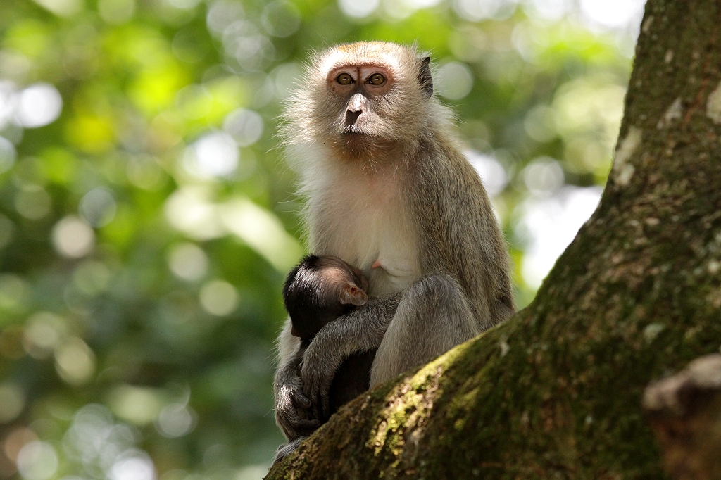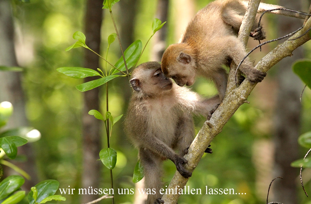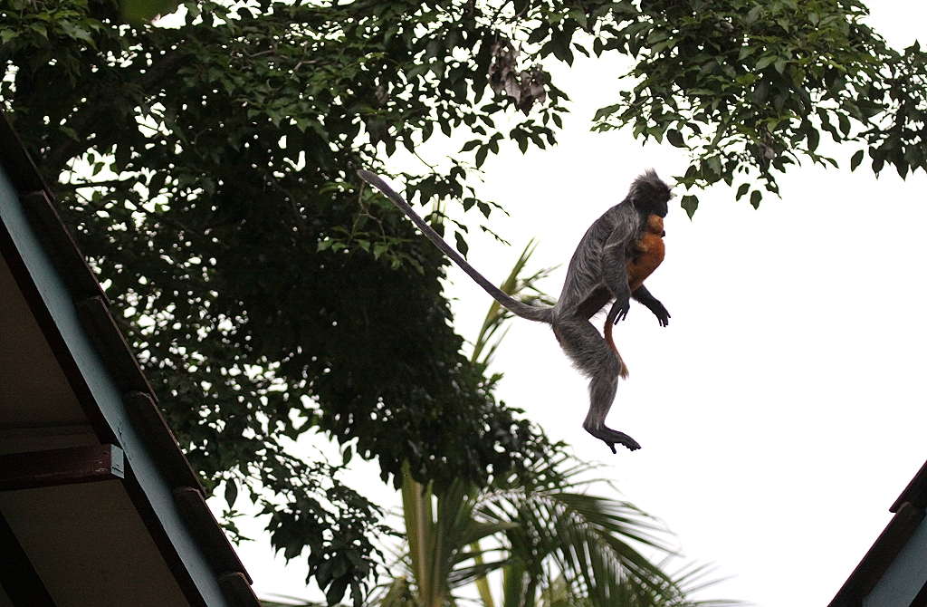 Wir konnten beobachten wie eine ganze Herde Affen von den Bäumen auf ein Chaletdach sprang und von dort mit weiten Sprüngen auf die nächsten Chalets. Manche liefen auch am Boden herum und kletterten geschickt und sehr schnell an den Chalets empor. Einige weibliche Tiere hatten ihre Jungen dabei, die sich bei den großen Sprüngen sicher am Fell der Mutter festhielten. Das sah schon sehr sportlich aus. |