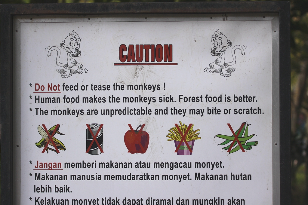 Diese Affen sind wirklich unberechenbar. Tomoko konnte auch noch einen Coppersmith Barbet fotografieren. Da wir Hunger hatten, fuhren wir gegen 18:00 Uhr wieder zum Supermarkt, wo wir schon gestern gegessen hatten. Wir aßen beide thailändische Gerichte, die wirklich hervorragend schmeckten und mit einem Euro pro Gericht wahnsinnig preiswert waren. Da unsere vor zwei Wochen gekauften 24 Dosen Bier langsam zu Ende gingen, sorgten wir für Nachschub. Natürlich kauften wir auch Wasser und als Obst wieder Mangos. Zurück im Hotel schauten wir noch etwas ins Internet. Ich buchte online die letzten Hotels für Johor Bahru und Singapur. Dann schrieb ich meinen Reisebericht zu Ende und anschließend gingen wir wieder früh schlafen. |
