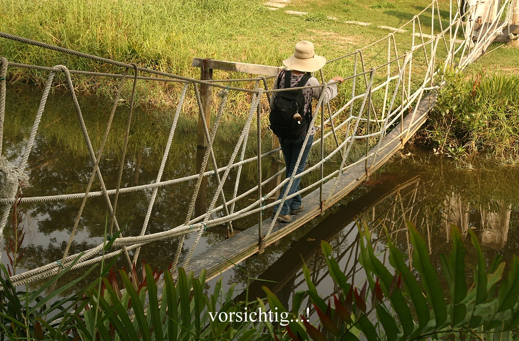 Wir gingen heute im wesentlichen den gleichen Trail wie gestern, nur diesmal in umgekehrter Richtung. Zunächst führte der Weg durch die Mangroven zu einem kleinen Fluss, den wir vorsichtig auf einer schwankenden Hängebrücke überquerten. |