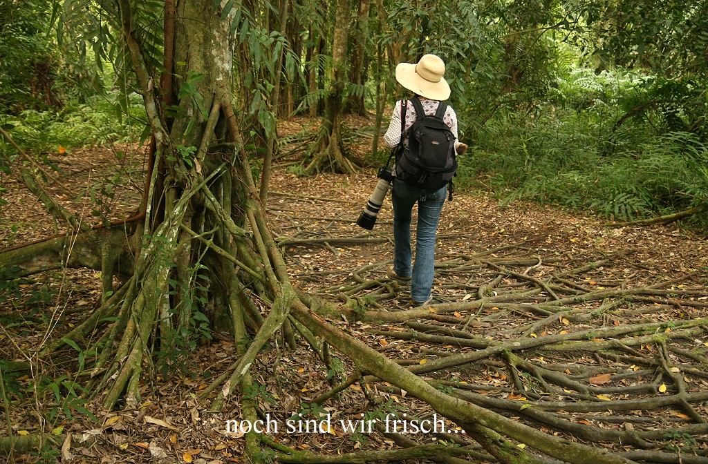 An dieser Stelle befand sich die erste Schutzhütte, wo wir auch wieder auf die Affen von gestern trafen, die sich diesmal jedoch außerhalb der Hütte aufhielten, so dass wir einen Moment dort sitzen konnten, um einen Schluck Wasser zu trinken. Langsam gingen wir weiter. Wir hörten viele Vogelstimmen, doch es war wie immer schwer, in dem dichten Mangrovengestrüpp etwas zu erkennen. |
