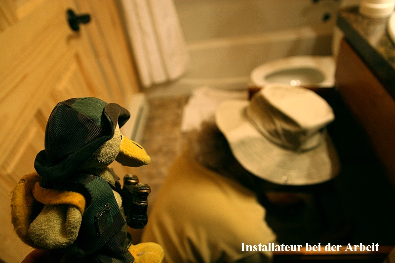 Die Kanada-Gänse mit ihren Jungen waren alle noch da, ebenso wie einige Yellow-headed Blackbirds, Red-Winged Blackbirds, Cinnamon teals, Robins sowie in der Ferne drei Kraniche. Gegen 18:00 Uhr kamen wir dann bei unserem gebuchten Hotel an, dem Elk Country Inn. Unsere Blockhütte Nummer 221, bestehend aus Schlafzimmer, Wohnraum mit Küche und Bad roch angenehm nach Holz. Ein so schönes und geschmackvoll eingerichtetes Hotelzimmer haben wir selten gesehen, der Preis von 122 $ + Tax pro Nacht war auch erstaunlich niedrig. Wir ruhten uns 45 min aus und fuhren dann ins Teton Steakhouse. Das Senior-Steak für 13,95 $ schmeckte sehr gut, Tomokos Steak-Sandwich auch. Anschließend kauften wir in einem riesigen Supermarkt (Albertsons) unser Frühstück und Picknick für den nächsten Tag ein. Als wir dann müde gegen 21:00 Uhr unser Zimmer erreicht hatten, fielen Tomoko beim Abnehmen ihrer neu gekauften schönen Ohrclips (kleine silberne Elche) einer in den Abfluss des Waschbeckens. Tomoko war den Tränen nahe. Was nun? Ich schaute mir die Konstruktion unter dem Waschbecken mal an. Die Plastikrohre konnte man auseinander schrauben. Nachdem ich mit Mühe noch ein Brett aus dem Waschtisch entfernt hatte, gelang es mir, das gesamte Abflussrohr auseinander zu schrauben. Ich lehrte das Rohr über der Badewanne aus und siehe da, der kleine silberne Elch kam wieder zum Vorschein. Tomoko war überglücklich. Ich schraubte alles wieder ordnungsgemäß zusammen und schnaufte erst mal kräftig durch. Das war ja noch mal gut gegangen. Da der Internetanschluss im Zimmer zu schwach war, fing ich gleich an, Tagebuch zu schreiben. Ein ereignisreicher Tag ging zu Ende und um 22:00 Uhr fielen wir müde ins Bett. |
