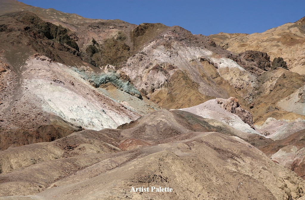 einer Stelle in der Ebene, wo sich im Laufe der Jahrtausende eine dicke Salzschicht abgelagert hatte, die durch Erosion eine bizarre Oberfläche bekommen hat. Weiter ging's zum "Badwater", der mit 85 m unter dem Meeresspiegel tiefsten Stelle im Death Valley. Eine weiße Salzfläche erstreckt sich von hier weit bis zum Horizont. Inzwischen zeigte das Thermometer 41°, zu heiß um lange herum zu wandern. Als nächstes fuhren wir über den Artist Drive. |