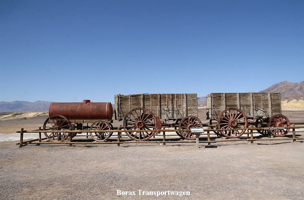 So langsam wurden wir müde. Tomoko und ihre Eltern stiegen noch mal bei den ehemaligen Borax-Förderstellen aus und besichtigten auf einem kleinen Trail die dort ausgestellten Arbeitsgeräte und Maschinen. Allzu lange blieben sie jedoch nicht, da es viel zu heiß war. Allmählich wurde es Zeit zurückzufahren. Wir brauchten etwa zweieinhalb Stunden bis wir wieder in Las Vegas ankamen. Nach einer erfrischenden Dusche trafen wir uns im Restaurant zum letzten Abendessen auf dieser Reise. Tomokos Vater hatte am Morgen schon für uns vier jeweils einen Buffet-Tagespass für 29,90 $ gekauft, mit dem man Frühstück, Mittagessen und Abendessen bekommt. Obwohl wir das Mittagessen nicht eingenommen hatten, war der Preis günstiger, als wenn wir dafür einzeln bezahlt hätten. Nach diesem heißen Tag gingen wir früh schlafen. |