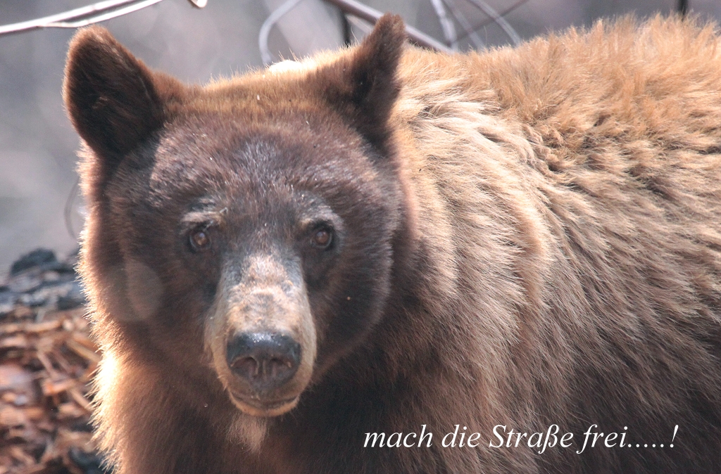 Ich nahm meine Videokamera und filmte diese wirklich aufregende Szene. Plötzlich bemerkte ich auf dem Bildschirm, wie die Bärenmutter auf mich zukam. Offensichtlich plante sie die Straße zu überqueren, ausgerechnet an der Stelle wo ich stand. Als sie gerade noch 5 m von mir weg war, machte ich schnell ein paar Schritte zur Seite und alle 3 Bären überquerten die Straße direkt neben mir. Ich hatte einen gehörigen Schrecken bekommen, so dicht hatte ich mir die Begegnung nicht vorgestellt. Noch etwas erschreckt aber voller Begeisterung fuhren wir weiter. Als wir die Hauptstraße erreicht hatten und ein paar hundert Meter weitergefahren waren, plötzlich wieder einige haltende Autos. Bär Nummmer 7 für heute war aufgetaucht. |