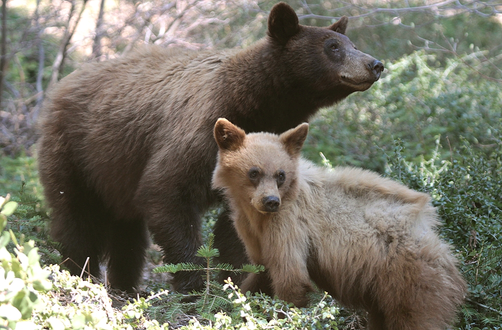 Hier machten wir eine kleine Pause und gingen dann weiter, die Bären immer im Blick. Die schienen jedoch von uns keine Notiz nehmen zu wollen. Nach einer kurzen Strecke zweigte der Pfad ab in den Wald und nach insgesamt 2 Stunden und 4,7 km Weg erreichten wir wieder den Parkplatz. Unsere Beine taten weh und wir waren froh wieder sitzen zu können. Kaum waren wir abgefahren, als uns ein kleiner Stau auf der Straße etwas Besonderes signalisierte. Es lohnte sich anzuhalten, denn wir sahen unmittelbar neben der Straße, wie eine Bärenmutter mit 2 jungen Bären Futter suchte. |