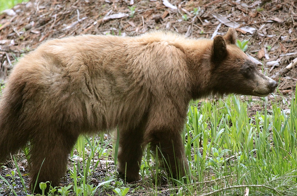 Nach einer knappen Stunde erreichten wir Huckleberry Meadow, eine weitere grasbedeckte Lichtung im Wald, und plötzlich entdeckte ich in einiger Entfernung einen großen braunen Bären, der gemütlich in der Wiese nach Futter suchte. |
