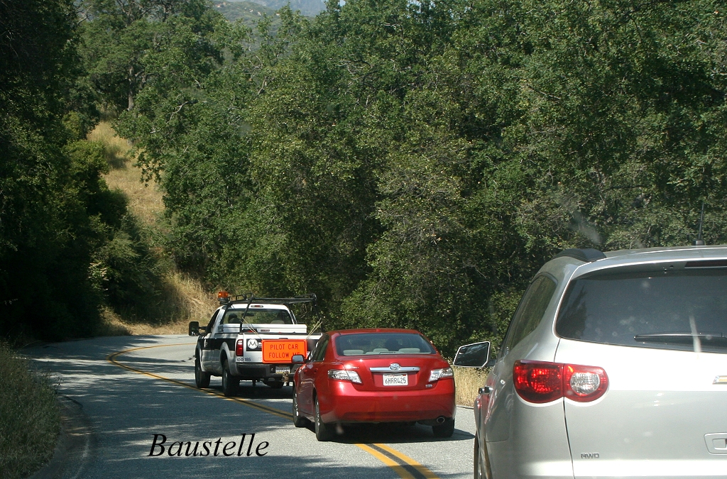 Um 7.10 h wurde ich wach. Tomoko schlief noch und war auch noch müde. Kurz vor 8.00 h schaffte sie es aber auch aufzustehen. Nach dem Frühstück trafen wir uns alle um 9.30 h am Auto, luden das Gepäck ein und checkten aus. Zunächst besorgten wir uns in einem großen Supermarkt (Safeway) etwas zu essen fürs Mittags-Picknick. Tomoko kaufte für uns beide Sushi. Da der Highway 1 nach Süden nach Auskunft eines Polizisten immer noch wegen eines Erdrutsches gesperrt war, mussten wir unsere ursprünglich geplante Reiseroute ändern. Somit konnten wir nicht über die schöne Strecke vorbei an Carmel und Big Sur fahren und die See-Elefanten bei Cambria besichtigen. Stattdessen mussten wir von Monterey nach Osten bis zum Highway US-101, dann ein Stück nach Süden und wieder nach Osten über den Highway US-198. Das Wetter wurde zunehmend sonniger, als wir die neblige Küstenregion verlassen hatten. Auch die Temperatur stieg merklich an. Gegen 12.00 h suchten wir nach einem geeigneten Platz für ein Picknick, doch wir befanden uns auf einer einsamen menschenleeren Strecke im Landesinneren Richtung Osten (90 km kein Parkplatz, geschweige denn eine Ortschaft). Ringsum nur trockenes gelbes Gras, keine Bäume mehr. Endlich fanden wir doch eine Stelle an einem kleinen Eukalyptus-Hain, der etwas Schatten spendete. Inzwischen war die Temperatur auf 32° geklettert. Wir blieben im Auto sitzen und ließen uns unser mitgebrachtes Essen schmecken. Da der Ort aber nicht allzu gemütlich war, fuhren wir nach einer halben Stunde weiter. Nach wenigen Kilometern erreichten wir die weite Ebene des California Valleys mit seinen endlosen Gemüse- und Obstplantagen. Die Straße führte jetzt schnurgeradeaus, ziemlich langweilig. Bei Tomoko meldeten sich leider erste Anzeichen einer Migräne. Gegen 14.00 h hielten wir kurz bei einem McDonalds und ich kaufte mir einen Kaffee gegen die Müdigkeit. Wir fuhren jetzt mit eingeschalteter Klimaanlage, was wesentlich angenehmer war. Kurz bevor wir die Ebene durchquert hatten, tauchte ein Obststand am Straßenrand auf. Hier gab es Erdbeeren und Kirschen, die beide hervorragend schmeckten. Nun ging es langsam wieder bergauf durch die Vorläufer der Sierra Nevada, vorbei am Kaweah-Stausee, durch den letzten Ort im Tal, Three Rivers, bis zum Eingang in den Sequoia NP. Ein Ranger informierte uns über zu erwartende Baustellen auf der Strecke. Es könnte sein, dass die Strasse eine Stunde lang gesperrt sei. Wenn wir gegen 16.00 h die gesperrte Stelle erreichen würden, wäre sie wohl in unserer Richtung offen. Also beeilten wir uns. Ich fuhr die zahlreichen Kurven, in denen es jetzt steil nach oben ging, ziemlich zügig, und tatsächlich erreichten wir die Sperrung genau um 16.00 h. Hier standen schon etliche Autos, aber als wir ankamen setzte sich die Schlange gerade in Bewegung, Glück gehabt. Im Schneckentempo ging es jetzt hinter einem sogenannten "Pilot Car" etwa 3 km aufwärts. |