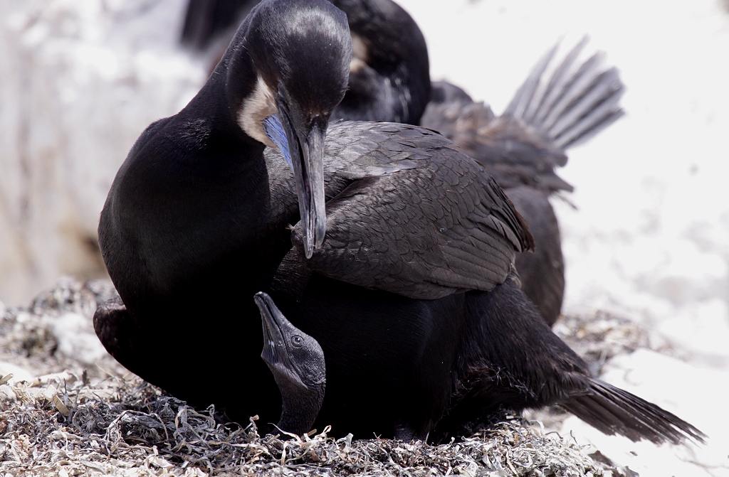 Sie waren zum greifen nah. Am Ende des Stegs nach etwa 400 m bot sich uns ein unglaubliches Bild. Hunderte von prächtigen Brandt`s Kormoranen brüteten hier auf großen Steinen, die als Schutz für den Hafen dienen. Auf den Felsen reihte sich ein Nest an das andere. |