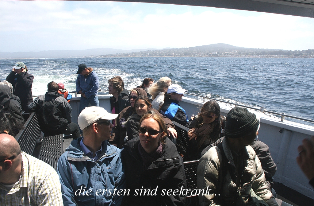 Einige Sea Lions begleiteten uns ein kleines Stück. Als aber das Schiff die offene See erreicht hatte, wurde es von den mächtigen Wellen kräftig durchgeschüttelt. Wir hatten rechtzeitig vorher ein Medikament gegen Seekrankheit eingenommen und blieben davor verschont. Einige andere Passagiere bekamen jedoch echte Probleme. Zunächst waren die Gesichter noch fröhlich, aber mit zunehmender Dauer wurden einige merklich blass. Wir fuhren etwa 13 km aufs offene Meer hinaus. Das Wetter war inzwischen sonnig, doch es blies ein kräftiger Wind, der die See zu hohen Wellen auftürmte. Unser relativ kleines Schiff kämpfte sich wacker hindurch, doch es ging immer wieder hoch und runter, dass man ohne an der Reeling sich festzuhalten sich kaum bewegen konnte. Zunächst tauchten einige Delfine auf, die elegant durchs Wasser pflügten. Fotografieren war unter diesen Bedingungen äußerst schwierig. Dann endlich der erste Wal, ein Humpback Whale. |