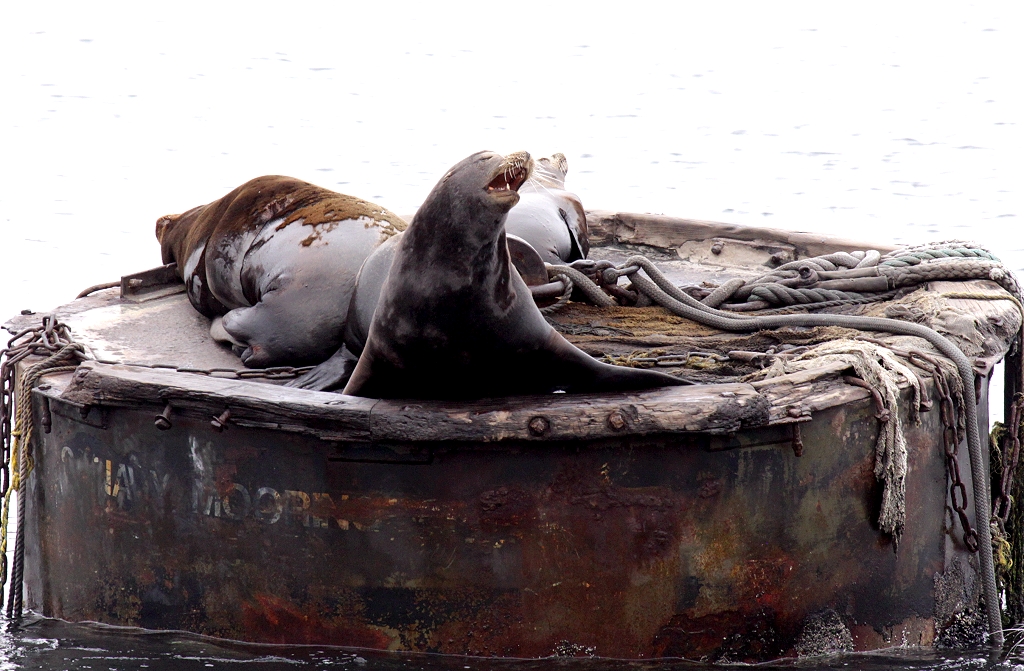 Das Wetter war sehr bewölkt, es regnete aber nicht. Wir spazierten ein wenig umher. Dann fuhren wir zurück und kauften ein paar Sandwiches, bzw. Sushis für unser Mittags-Picknick. Das nahmen wir dann ganz in der Nähe des Meeres auf einem kleinen Parkplatz mit schönem Blick über den Hafen ein. Tomoko und ich marschierten anschließend los ein paar hundert Meter bis ans Ende eines ins Meer gebauten Stegs. Schon auf dem Weg dahin sahen wir etliche Seelöwen faul auf den Felsen in der Sonne liegen. |