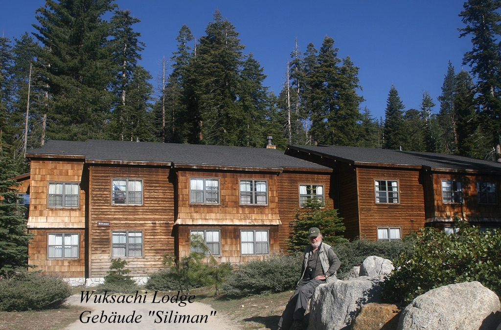 Immer höher wand sich die enge Straße, die anscheinend an dieser Stelle komplett neu gebaut wird. Endlich waren wir oben auf einer Höhe von 2100 m. Schneereste waren noch überall zu sehen, auch die Temperatur war deutlich niedriger mit 18°. Die ersten riesigen Sequoias standen am Straßenrand. Nach einer weiteren Viertelstunde erreichten wir unser Ziel, die Wuksachi Lodge. Die Aussicht auf die schneebedeckten Berge der Sierra Nevada war fantastisch. Wir erhielten ein schönes großes Zimmer in einem separaten Gebäude namens "Siliman" mitten im Wald. Nachdem wir unsere Sachen aufs Zimmer gebracht hatten (auch alle Nahrungsmittel wegen der Bären), machten wir sofort einen kleinen Spaziergang in die nähere Umgebung. Zahlreiche Vögel zwitscherten in den Bäumen. |