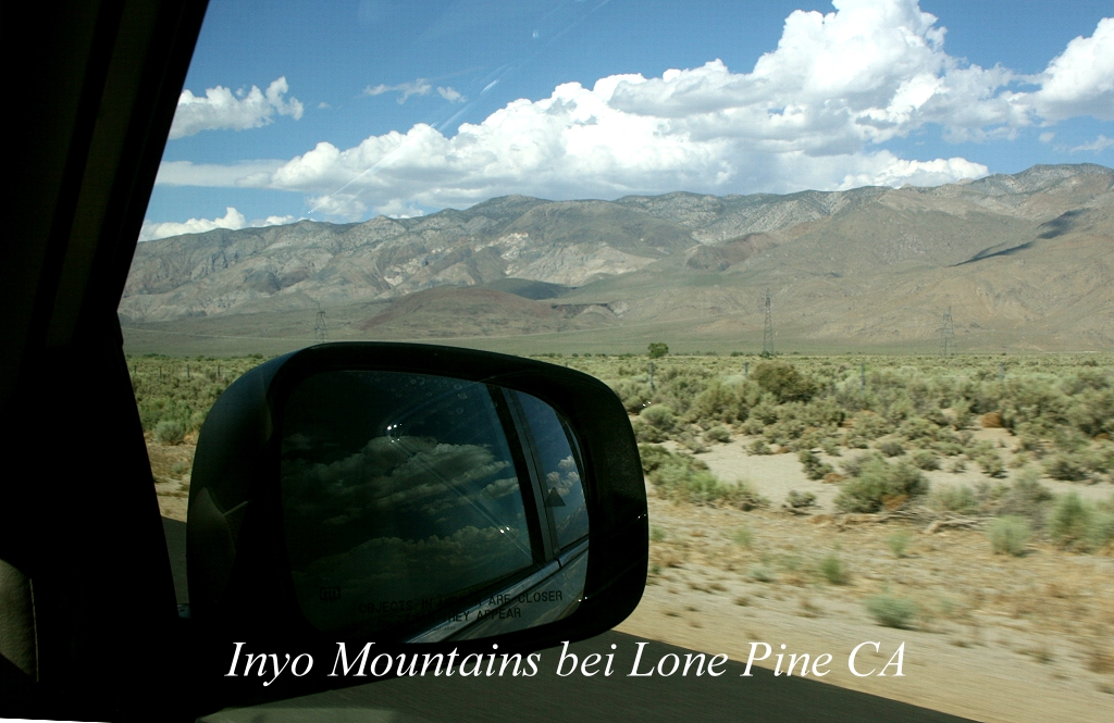 Nach dem Frühstück um 7.30 h checkten wir um 9.00 h aus und fuhren los nach Norden Richtung Bishop CA, einer kleinen Stadt am Ostrand der Sierra Nevada. Hier wollten wir einen Zwischenstopp auf dem Weg in den Yosemite Nationalpark machen. Es war schon sehr früh sehr heiß. Zunächst fuhren wir über den Highway 247 quer durch die Wüste nach Apple Valley, wo wir auf den Highway US 395 trafen, der am Ostrand der Sierra Nevada nach Norden verläuft. |