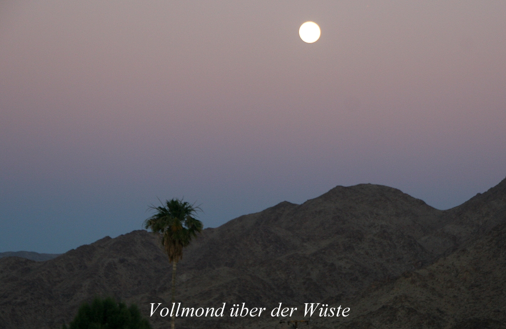 Er flog immer wieder aus und kam mit Beute zurück. Ich war inzwischen auch dazugekommen und beobachtete das Ganze durchs Spektiv. Um 17.30 h fühlte ich mich ein wenig schwindelig, wohl von der immer noch brütenden Hitze. Also zogen wir uns ins von der Klimaanlage gut gekühlte Auto zurück und fuhren nach Yucca Valley zum Abendessen. Wir hatten uns ein Restaurant "Sizzler" mit großer reichhaltiger Salatbar ausgesucht. Tomoko und mir schmeckte es sehr gut. Mir ging es inzwischen auch wieder besser. Gegen 20.00 h waren wir wieder zurück im Hotel. Nach einer erfrischenden Dusche schrieb ich noch mein Tagebuch und schaute noch etwas Internet. Ein prächtiger Vollmond stand über der Wüste am Himmel. |