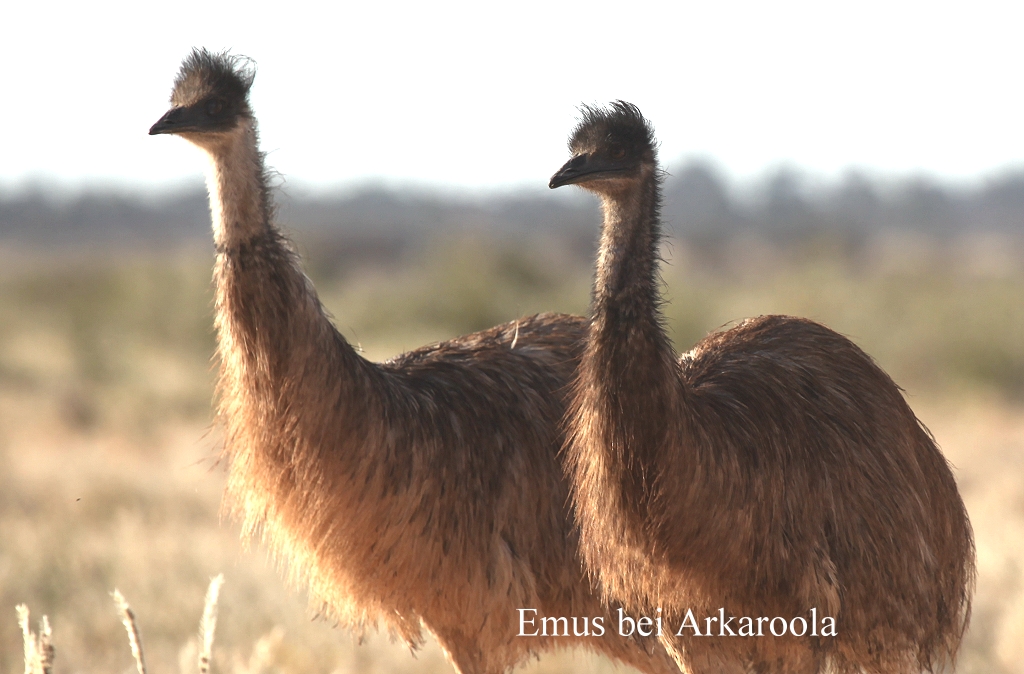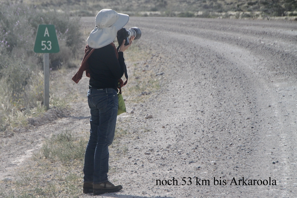 In Blinman machten wir eine kleine Kaffeepause im Wild Lime Café, wo wir uns zusätzlich zum obligatorischen Cappuccino für ein Quandong-Törtchen mit Vanilleeis entschieden, köstlich. Quandong wird auch wilder Pfirsich genannt, schmeckt aber mehr nach Pflaume. Die Frucht ist nicht sehr ergiebig und daher ziemlich teuer. Wie uns die freundliche Café-Besitzerin, eine Deutsche, sagte, kostet sie im Einkauf ein Kilo dieser Früchte 66,- AUS$. Daher war der Preis von 7$ für ein Törtchen durchaus angemessen. Um 12.40 Uhr beendeten wir die kurze Pause, fuhren 2 km zurück und bogen dann auf die 152 km lange unbefestigte Straße nach Arkaroola ab. Auf dieser Strecke gibt es keinerlei andere Ortschaft mehr, nur staubige Piste. Gleich zu Anfang identifizierten wir einen jungen Kuckuck (Fan-tailed Cuckoo).