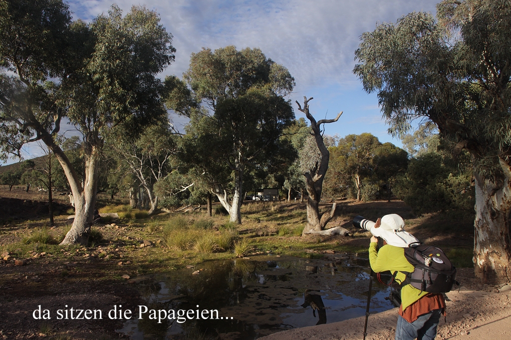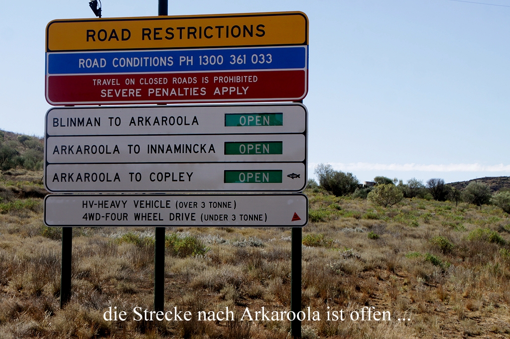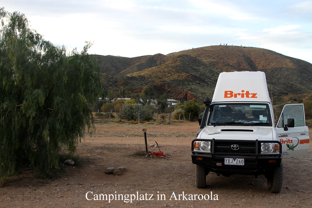 Die Wolken, die heute tagsüber teilweise aufgezogen waren, verschwanden wieder vollständig, so dass sich ab 18.00 Uhr ein sternenklarer Himmel über uns erstreckte. Arkaroola verfügt auch über ein Observatorium, wo man die Sterne beobachten kann. Mal sehen, vielleicht schauen wir morgen da mal vorbei. Nach dem obligatorischen Spülen des Geschirrs im Waschraum des Campingplatzes zogen wir uns ins vom Heizgerät wohlig angewärmte Innere unseres Autos zurück und begannen mit unserer gewohnten allabendlichen Tätigkeit, Tagebuch schreiben und Fotos sichten. Wir machten noch ein wenig Planspiele für die nächsten Tage. Die anstrengende Fahrt hatte uns jedoch so müde gemacht, dass wir früh schlafen gingen.