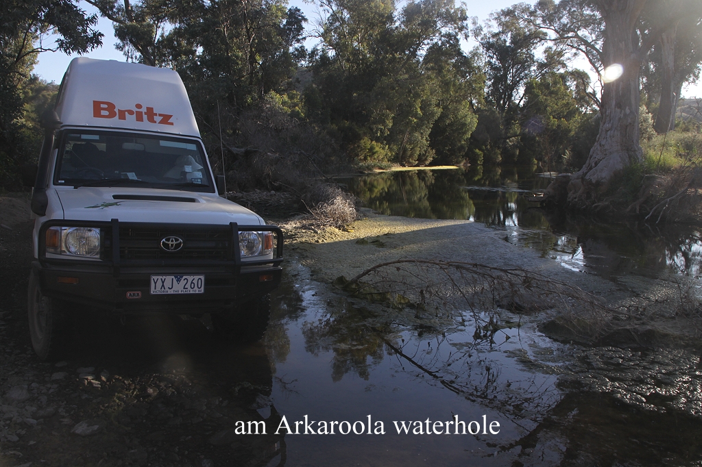 Ein zufällig vorbeifahrender Cross-Radfahrer(!!) klärte uns auf, dass wir an besagtem Wasserloch schon vorbeigefahren waren. Währenddessen entdeckte Tomoko hoch in einem Baum über uns 2 Little Corellas, eine weiße Kakadu-Art, die wir bisher noch nicht zu Gesicht bekommen hatten. Wir fotografierten ausgiebig, war doch auch die Umgebung sehr malerisch. Ein kurzes Video kann man hier sehen: Little Corella Dann wendete ich das Auto und wir fuhren ein kleines Stück zurück. |