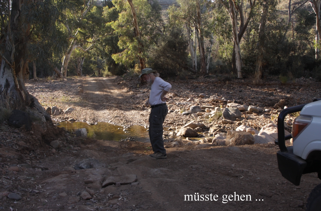 Ja, da war die Abzweigung zum Arkaroola Waterhole. Ein Warnschild wies darauf hin, dass die 1,5 km - Strecke nur mit Vierradantrieb befahren werden darf. Kaum war ich auf den Weg abgebogen, wusste ich auch warum. Dieser Weg war wirklich nicht mit einem normalen PKW zu schaffen. Also hielt ich an, verriegelte die Vorderradnaben manuell und schaltete zum erstenmal das Vierradgetriebe ein. Damit ließ sich die Piste tatsächlich bewältigen, auch für einen Neuling wie mich. Es war schon abenteuerlich, wie das Auto durch die tiefen Sandlöcher, über felsige Partien und dicken Steine schaukelte, aber die 8-Zylinder-Maschine ließ uns nicht im Stich. Einige Kängurus schauten uns zu, die meisten Euros, aber eins war wohl ein junges Red Kangaroo. |