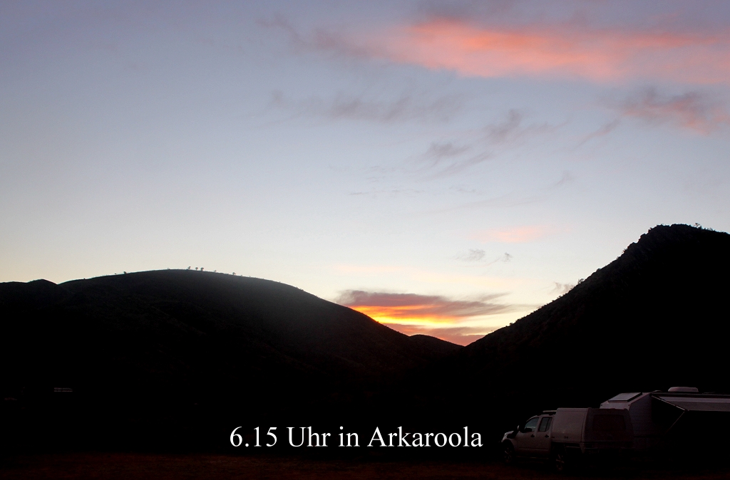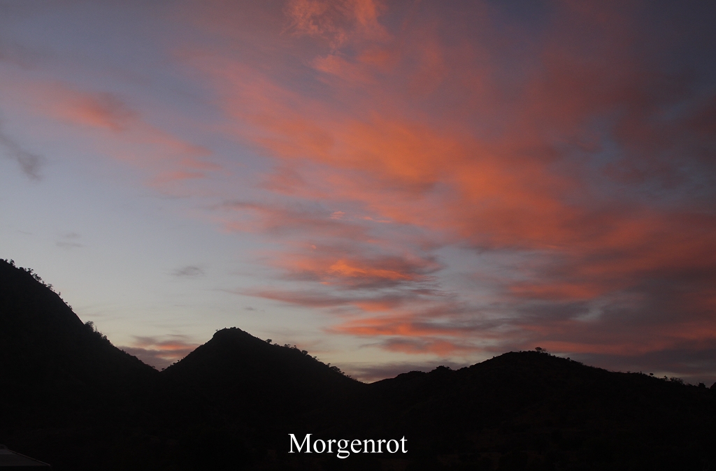 Gegen 6.15 Uhr wurden wir beide wach, als der Himmel im Osten sich langsam grau färbte. Der Tag brach langsam an. Die Farbe der vereinzelten kleinen Wölkchen änderte sich allmählich zu rosa. |