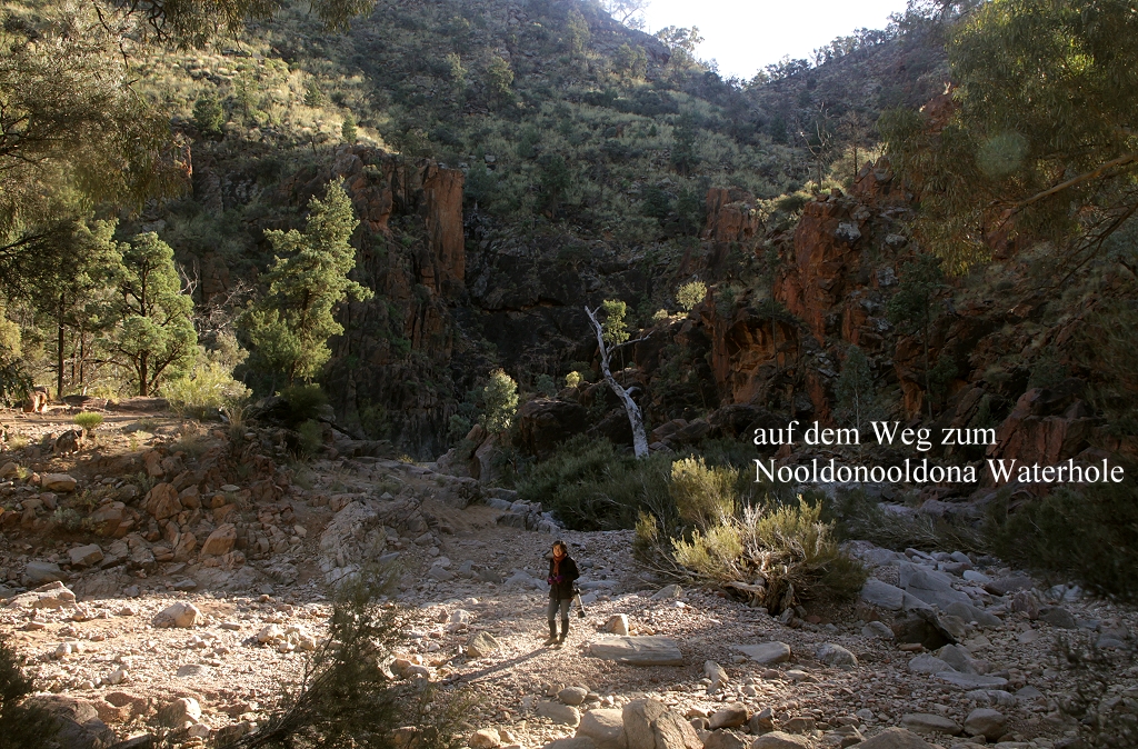 Gegen 9.00 Uhr erreichten wir unser Ziel, das Nooldonooldona Waterhole. Der Name entstammt der Sprache der Aborigines, der Ureinwohner Australiens. Hier am Wasserloch war vogelmäßig überhaupt nichts zu sehen außer 2 Butcherbirds und ein paar Miners. Ich kletterte ein wenig zwischen den Felsen herum, auf denen einige interessante Pflanzen, hauptsächlich Yakkas, in den Felsspalten Halt gefunden hatten. Das Wasserloch selbst lag ziemlich im Dunkeln, eingebettet im Schatten zwischen hohen schroffen rotbraunen Felswänden. |