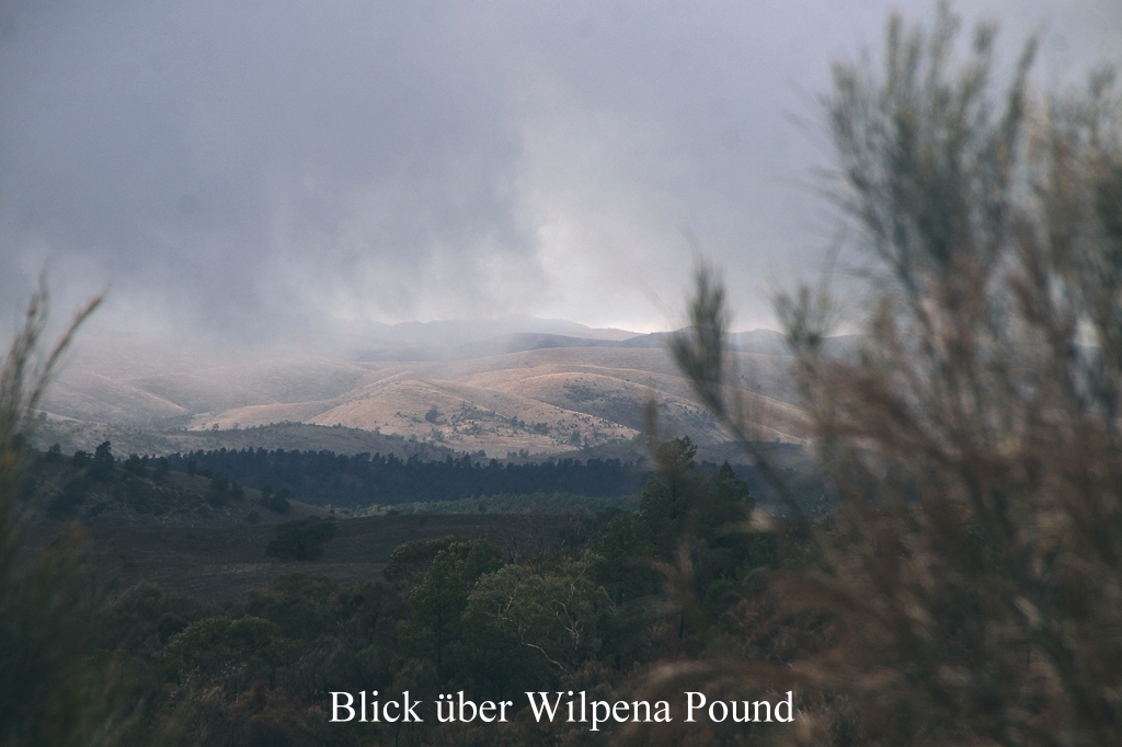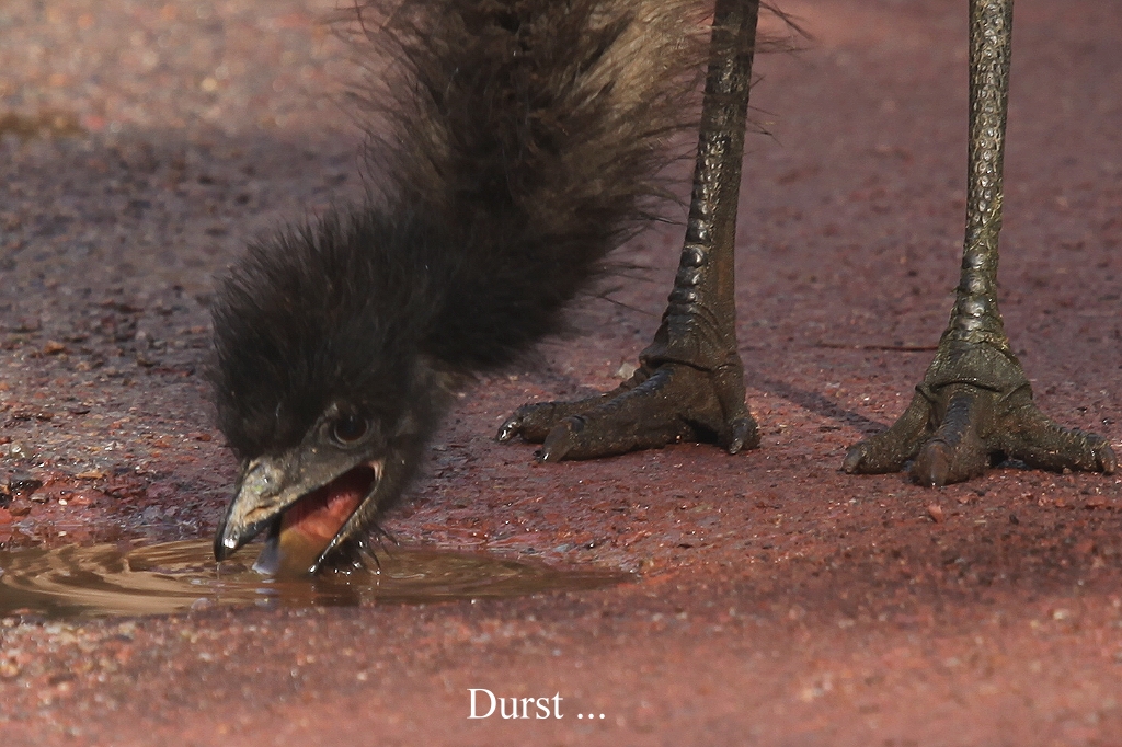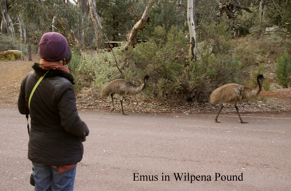 Um 13.55 Uhr erreichten wir endlich wieder festes Terrain. Nun waren es nur noch 10 km bis zu unserem heutigen Ziel Wilpena Pound, das wir nach insgesamt 140 km um 14.05 Uhr erreichten. Am Visitor-Center trafen wir einige Emus, die auf der Straße spazierten und Wasser aus verschiedenen Pfützen tranken. |