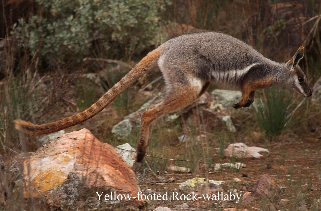 Es hatte offensichtlich gestern geregnet, weil die Wasserlöcher, die wir durchfahren mussten, mit viel Wasser gefüllt waren und auch die Piste nicht mehr staubig war. Gegen 11.45 Uhr erreichten wir die Stelle, wo wir vor einer Woche ein Yellow-footed Rock-Wallaby gesehen hatten. Wir stiegen aus und tatsächlich sahen wir 4 Rock-Wallabies ganz friedlich im hohen Gras, bzw. auf den Felsen sitzen, und das in der Mittagszeit, wo sie normalerweise sich versteckt halten. |