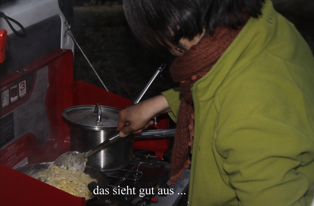 Am Himmel waren inzwischen dicke graue Wolken aufgezogen und alsbald fing es an zu regnen. Schnell gingen wir zum Auto zurück und verzogen uns ins trockene Innere. Es war zwar erst 15.45 Uhr, aber Tomoko fing schon mal an mit den Vorbereitungen fürs Abendessen. Ich begann mit meinem Tagebuch, während der Regen ziemlich heftig aufs Autodach trommelte. Als Tomoko mit dem Abendessen fertig war, hörte auch der Regen wieder auf. Die letzten Wolken verzogen sich rasch und machten einem wolkenlosen Himmel Platz. Heute gab es Polenta in Rotweinsauce mit Champignons, Tomaten und Zucchini, dazu tranken wir den Rest Merlot von gestern, schmeckte wieder toll. Es ist immer wieder erstaunlich, welche schmackhaften Gerichte Tomoko mit unserem primitiven Kocher und Zubehör hinbekommt. Es wird immer früher dunkler und die Kälte kriecht schnell in unsere Klamotten, aber mit unserem Heizgerät ist es im Auto wohlig warm. Hier schrieb ich noch mein Tagebuch von heute und beantwortete einige der erhaltenen E-Mails, die ich morgen abschicken werde. Heute nahmen wir uns auch die Zeit für eine ausgiebige Dusche nach 2 Tagen, die uns sichtlich gut tat. Später noch etwas lesen (Tomoko hatte ein interessantes Buch über Papageien gekauft) und planen für die letzten Tage, dann gingen wir wieder früh um 21.45 Uhr schlafen. |